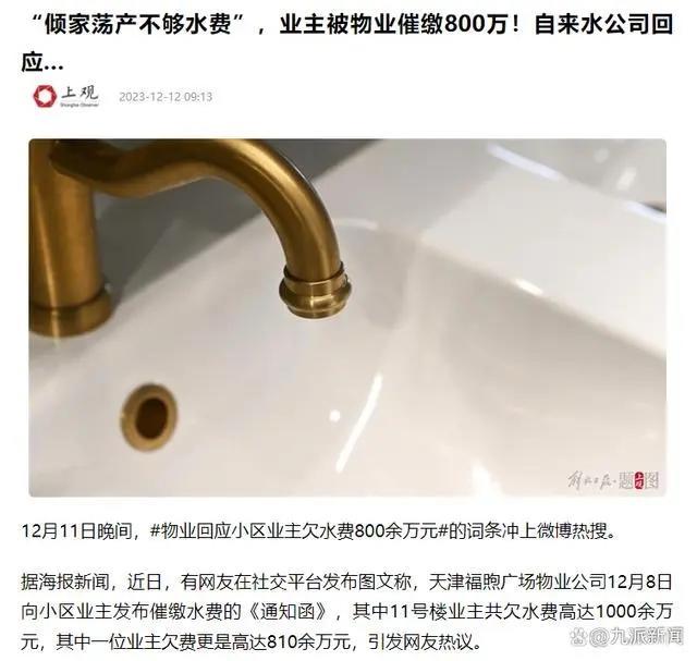 12月14日,一篇名为《泉州一小区物业催缴800万水费,自来水公司回应:情况属实》的文章在社交平台传播。该文章称,泉州市某小区的物业公司向业主催缴高达800万元的水费,并且自来水公司已证明情况属实。但文章中的截图显示,欠费金额为1000余万元。