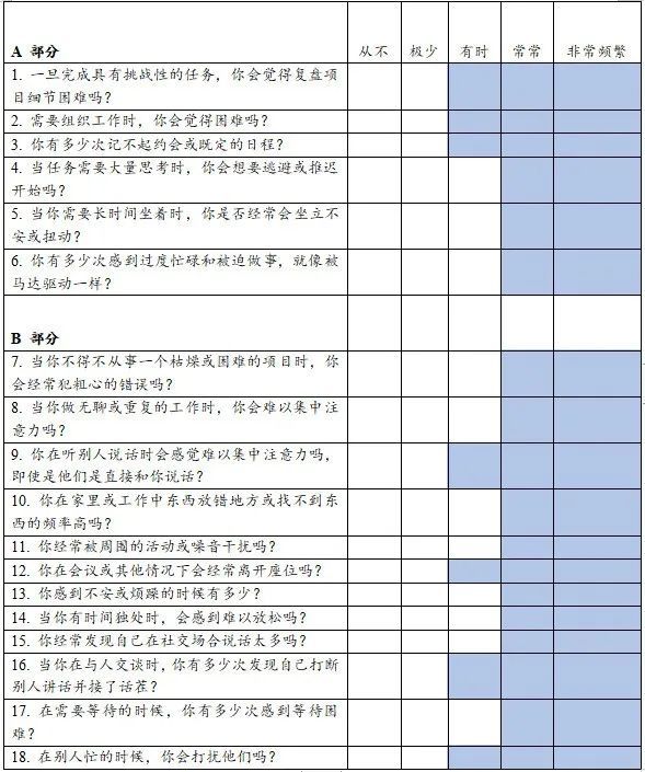 量表分为A、B两部分,前6个问题属于A部分,被认为是最能预测多动症症状的,剩余的12个问题属于B部分。