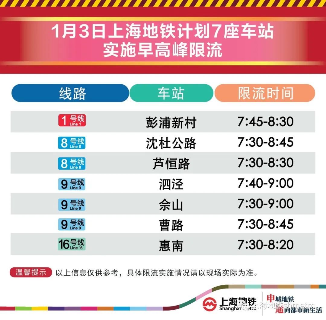 1月3日,上海地铁早高峰限流措施将继续实施,届时将有7座地铁站早高峰计划限流。
