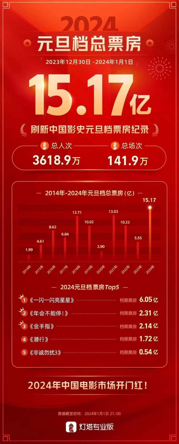 灯塔专业版数据显示,截至1月1日21时,2024年元旦档(2023年12月30日-2024年1月1日)档期票房达15.17亿元,刷新中国影史元旦档票房纪录,总观影人次3618.9万,总场次141.9万,《一闪一闪亮星星》《年会不能停!》《金手指》《潜行》《非诚勿扰3》位列档期票房榜前五位,档期票房分别为6.05亿元、2.31亿元、2.14亿元、1.72亿元、0.54亿元。