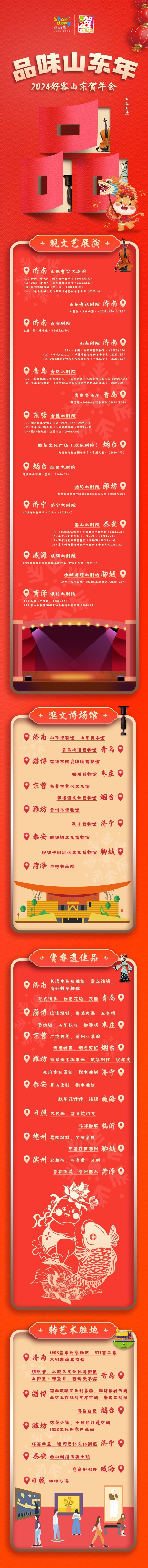 近日,2024“好客山东贺年会”正式启动,现场发布“乐享齐鲁活力年”四大主题产品,点燃年味激情。 其中“品味山东年”主题产品推荐全省各地文艺展演、文博场馆、非遗佳品、艺术胜地,让您在今年春节感受山东文博非遗魅力!