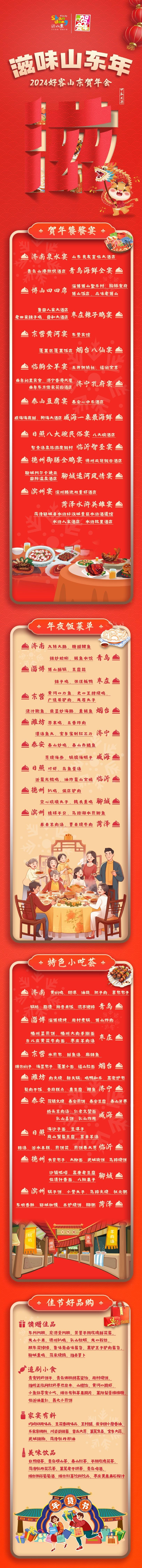 近日,2024“好客山东贺年会”正式启动,现场发布“乐享齐鲁活力年”四大主题产品,点燃年味激情。 其中“滋味山东年”主题产品推荐全省16市特色美食,您的鲁味年夜饭大餐菜单已备好,下滑获取!
