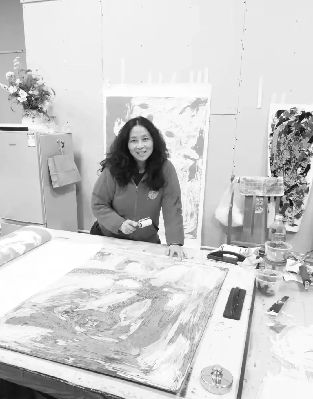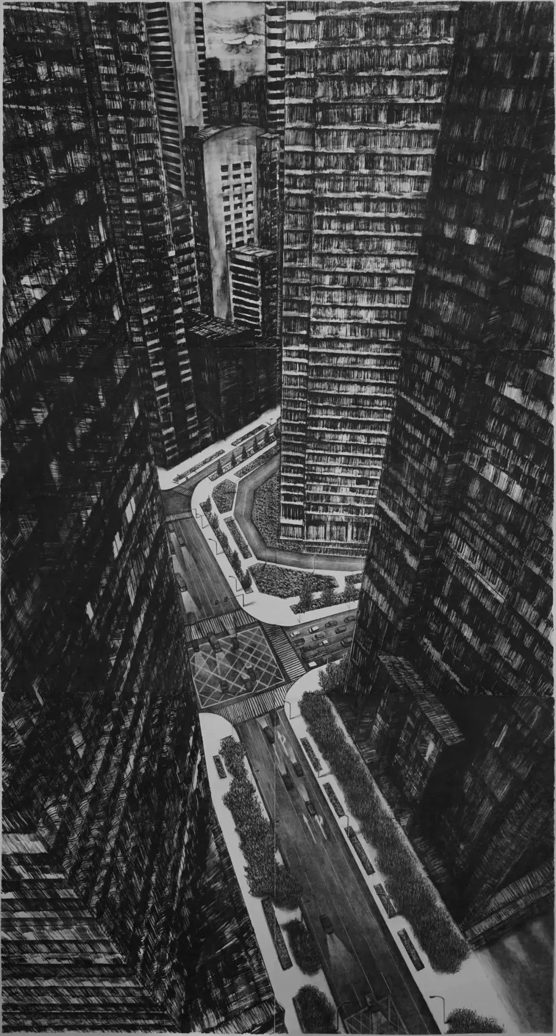 生活在上海这样的大都市,尤其像陆家嘴这样的地方,总会被丛林般的现代化建筑群所吸引,它给我们带来的不仅有视觉上时尚摩登的美感,也有心理上的震撼。《摩登印象》这幅版画作品通过运用石版药墨、石版蜡笔等石版画综合技法,描绘了都市丛林的视觉观感以及与日间喧闹感有所差异的内心世界与感性印象。