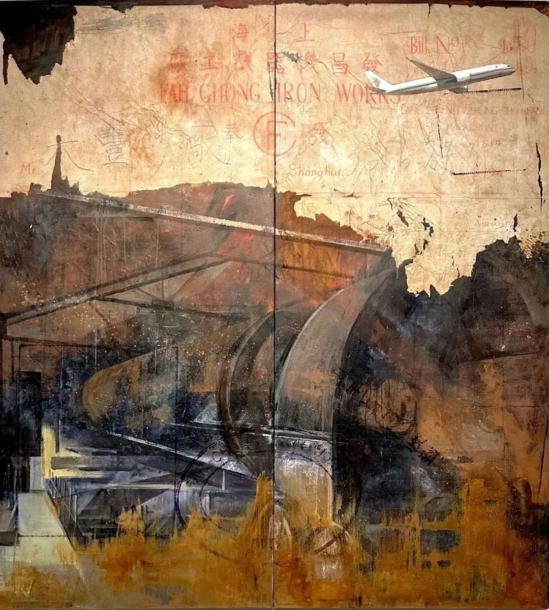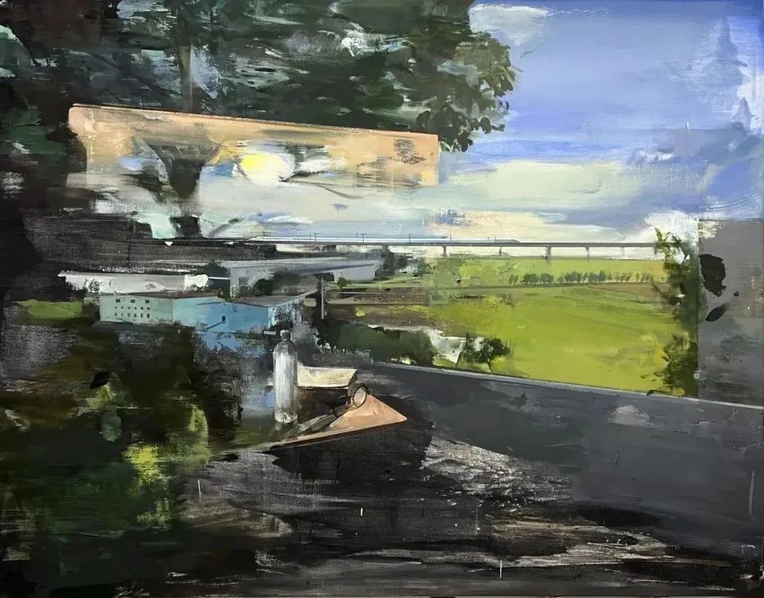 《望江南》的构思来自一次长三角地区的高铁旅行,扶窗远眺,林立的工厂与大片的农田飞驰而过,形成完美的律动感,一片江南新貌映入脑中。在画面中我虚构了几个空间并将它们叠加起来,其中有近景的列车桌面,中景是工厂与农田,远景有飞速划过的高铁,树影婆娑来自玻璃的反光和倒影。这几个交错的时空通过画面的结构串联,动与静,瞬间与永恒,凝聚成一瞬的诗意江南。