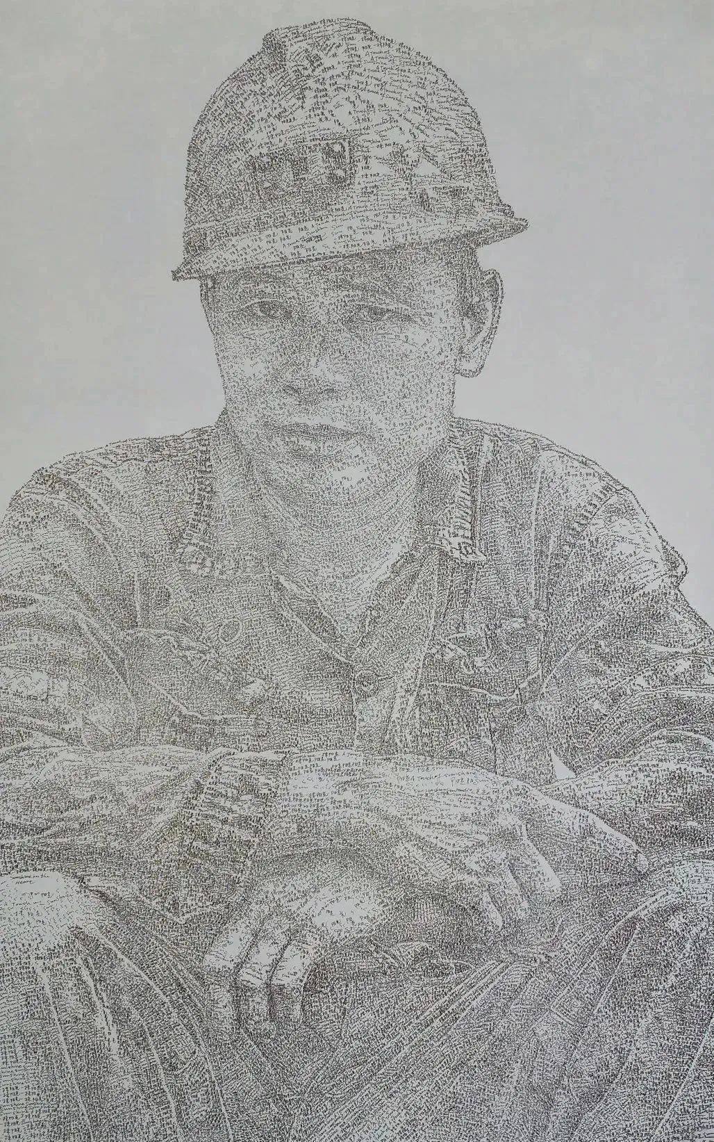 在这幅《一抹阳光》的版画中,我描绘了一位矿工,他的眼神和姿态传达出他休憩中的沉思。画面中细小的文字既代表着矿工的个体经历,也映射出人类集体的故事。“一抹阳光”寓意希望与坚韧不拔,象征着即使在黑暗的矿井中,也总有希望之光照进来。这幅作品是我对劳动者的致敬,以及对那些在艰苦环境中依然保持乐观精神的人们的赞美。