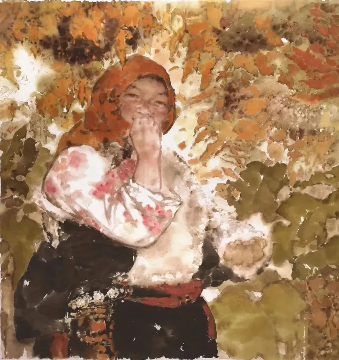 画中的藏族女孩正在微笑着品尝香甜的劳动成果,展现着由衷的喜悦。画面采用的是暖色调,内涵着火热、饱满、健康、壮丽。运用的是水墨重彩的画法,要重墨重色浓郁醇厚,要深入刻画不失精微,且要笔势强健色滋墨润气象浑然,是这件作品画法的难点。