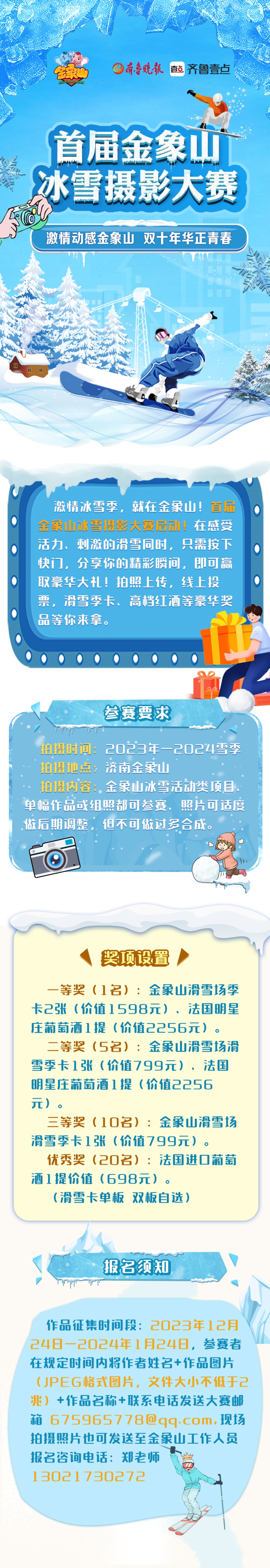 本次摄影主题大赛分作品征集和线上投票两个阶段。齐鲁晚报·齐鲁壹点将在投票平台对参赛作品进行展示,网友们公平公正地票选出获奖作品,参赛者可赢取滑雪季卡、高档红酒等豪华大礼。