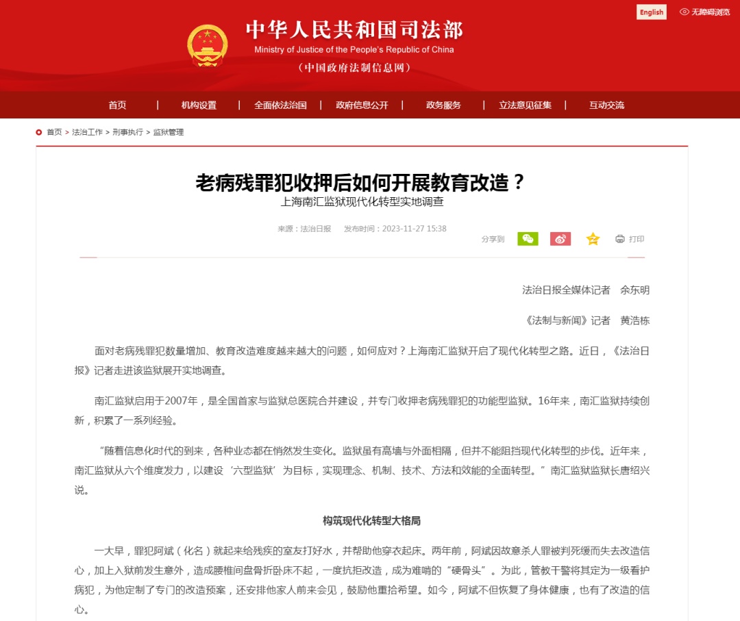前不久,上海监狱第十三届老病残罪犯监管改造研讨会如期而至,全国监狱系统同仁专家齐聚南汇监狱。会后,《法治日报》采写了通讯《老病残罪犯收押后如何开展教育改造?上海南汇监狱现代化转型实地调查》,司法部官网(中国政府法制信息网)全文转载。报道以南汇监狱作为上海全市专门关押改造老病残罪犯的功能性监狱建设为样本,描写发生在大墙里特殊罪犯的服刑故事和改造场景,注目中国式现代化进程中上海监狱推进高质量发展的探索实践之路。