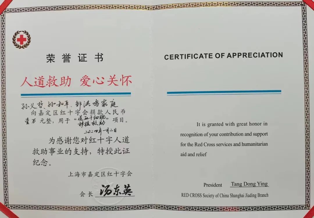 新年的另外一个仪式感,是和父母一起捐出1万元善款。1月2日,孙义哲的妈妈邹洪鸣代表全家向嘉定区红十字会捐出1万元,用于“造血干细胞移植救助”项目。