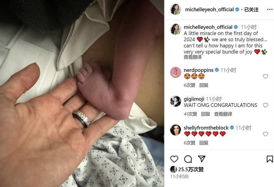 当日早些时候,杨紫琼在社交账号中分享了一张手托婴儿小脚丫的照片,配文:“2024年第一天的小奇迹,我们真的是太幸福了,无法告诉你,我为这非常特别的欢乐而感到多么高兴。”
