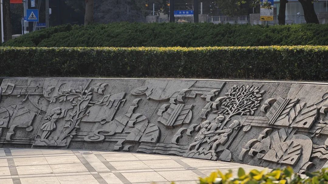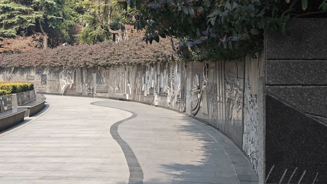 山体与草坪间的挡土墙也是一座文化景墙,设置“继往开来”浮雕,形象描绘了原闸北区近现代发展历程。