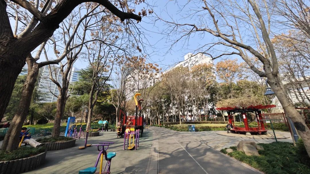 不夜城绿地是静安区最早实行24小时开放的公园绿地之一,能够通行非机动车的华盛路蜿蜒于绿地之中,将绿地分为东西两部分。