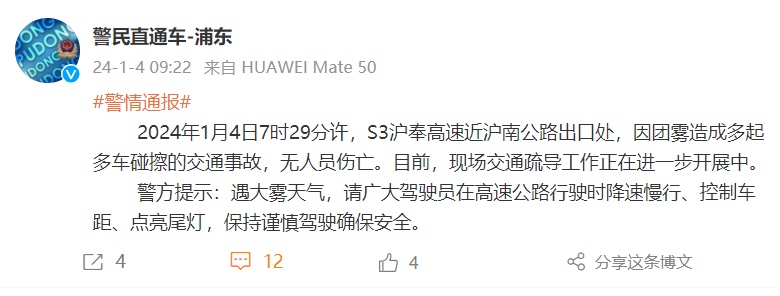 昨日,一条新闻让许多上海人格外揪心,S3沪奉高速近沪南公路出口处,出现多起多车碰擦事故。据上海浦东警方发布的警情通报表示,造成这次事件的元凶是“团雾”。