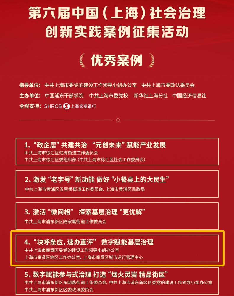 在2023年度第六届中国(上海)社会治理创新实践案例征集活动中,由区委党建办、区地区工作办、区城运中心联合申报的《“块呼条应,速办直评”数字赋能基层治理》(贤城金哨)入选优秀案例。