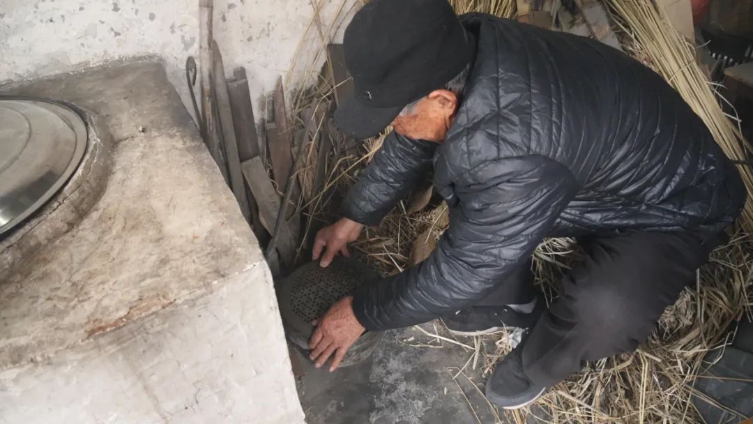 介绍完汤婆子,蔡老伯又拿来脚炉,将灶台里还冒着火星的炉灰,一点点扣进脚炉内,堆到炉口,再用脚将炉灰踩实,扣上炉顶,炉顶均匀地排布着上百个小细孔,热气就从孔中一点点冒出来,“将炉灰踩实这样使用时就不会产生浓烟,把人呛着。”