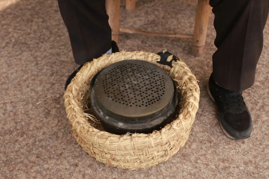 为了这次“老底子”的体验,蔡老伯专门用稻草编织了一个“脚炉窟”,把脚炉放在“窟”里。蔡老伯表示这个“脚炉窟”又能防风、又能保暖,过去还会在脚炉里放点花生,热着吃。据蔡老伯介绍,他们家的这个脚炉是结婚时老伴从娘家带来的,少说也有60多年了。