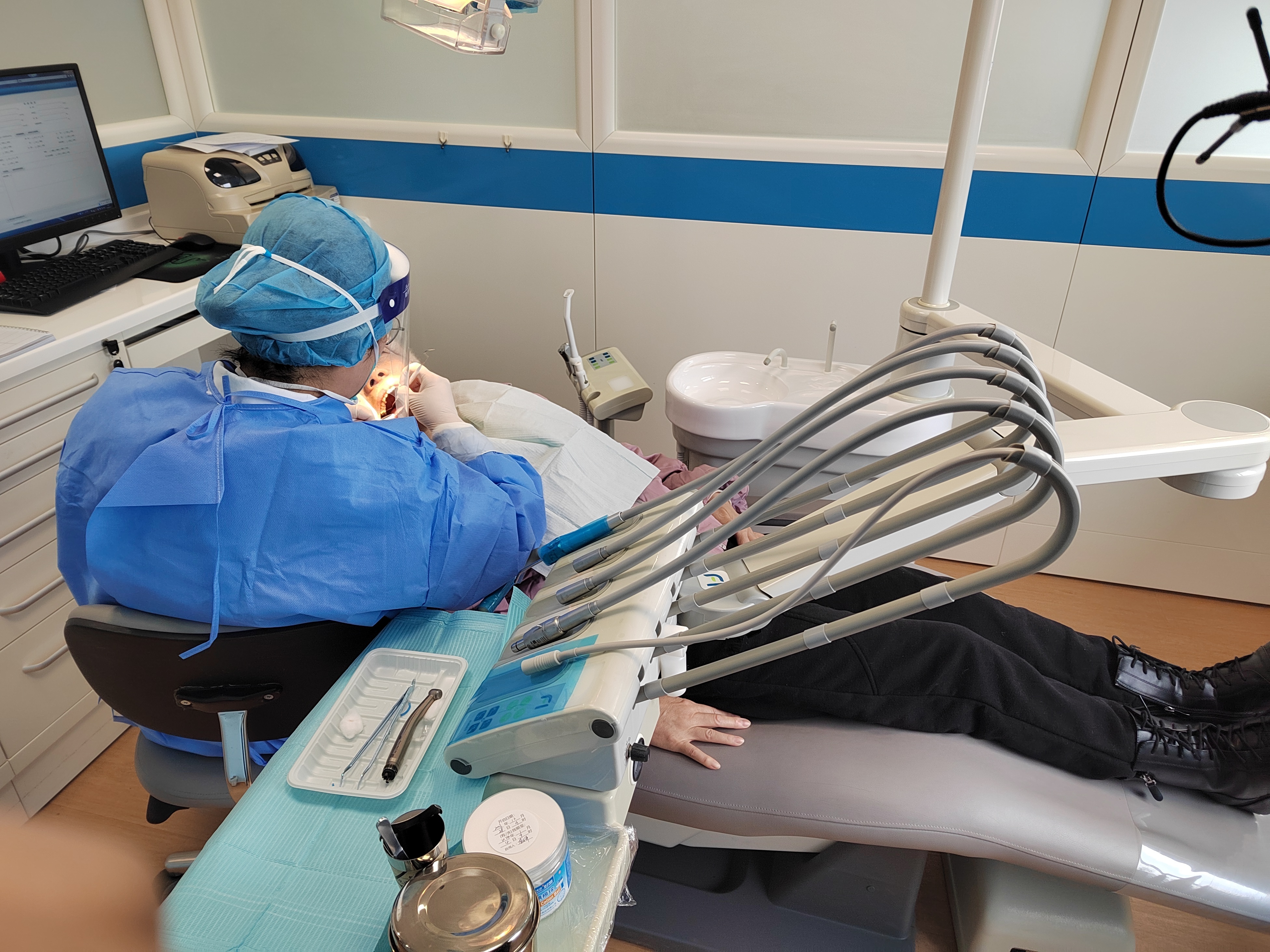 早上9点,记者在口腔科候诊区看到,等候的患者三三两两。走进近200平米的诊室,三个独立的诊疗区依次排开,每个诊疗区都配备了口腔综合治疗台,提供龋齿填充、根管治疗、牙齿拔除、牙齿修复等基本服务。