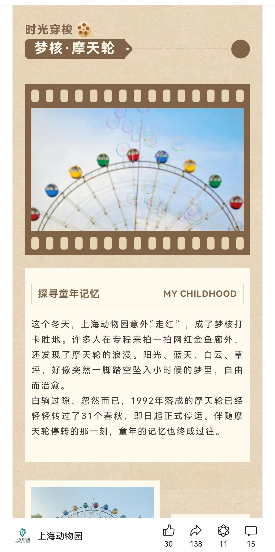 最近,一个令人有些遗憾的消息传来 上海动物园宣布:摩天轮停运了 ↓↓↓ 上海动物园的摩天轮于1992年落成,不知不觉间,已经轻轻转过了31个春秋。