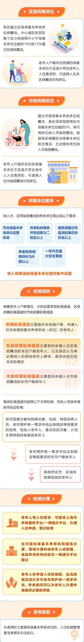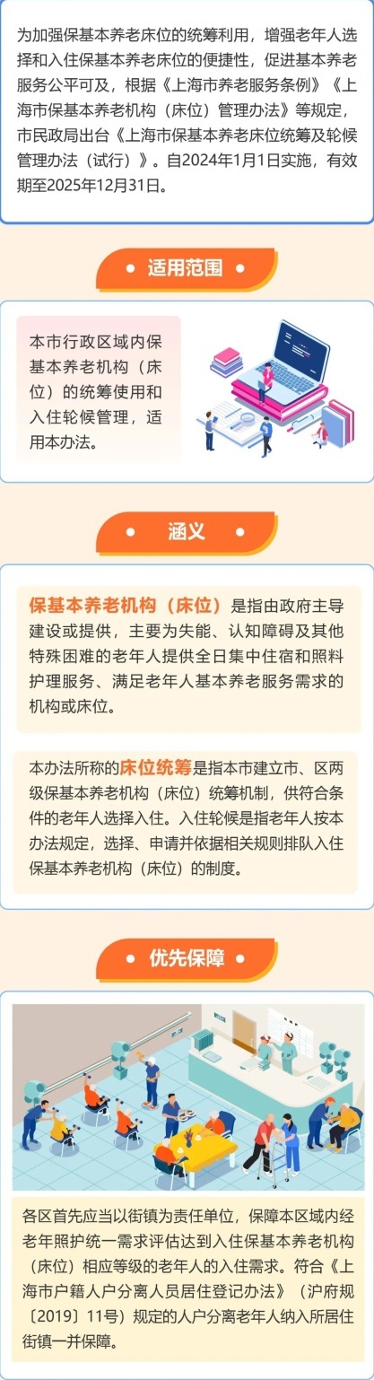 为落实《上海市养老服务条例》等要求,加强保基本养老床位的统筹利用,增强老年人选择和入住保基本养老床位的便捷性,促进基本养老服务公平可及,近日,市民政局出台了《上海市保基本养老床位统筹及轮候管理办法(试行)》,详见↓