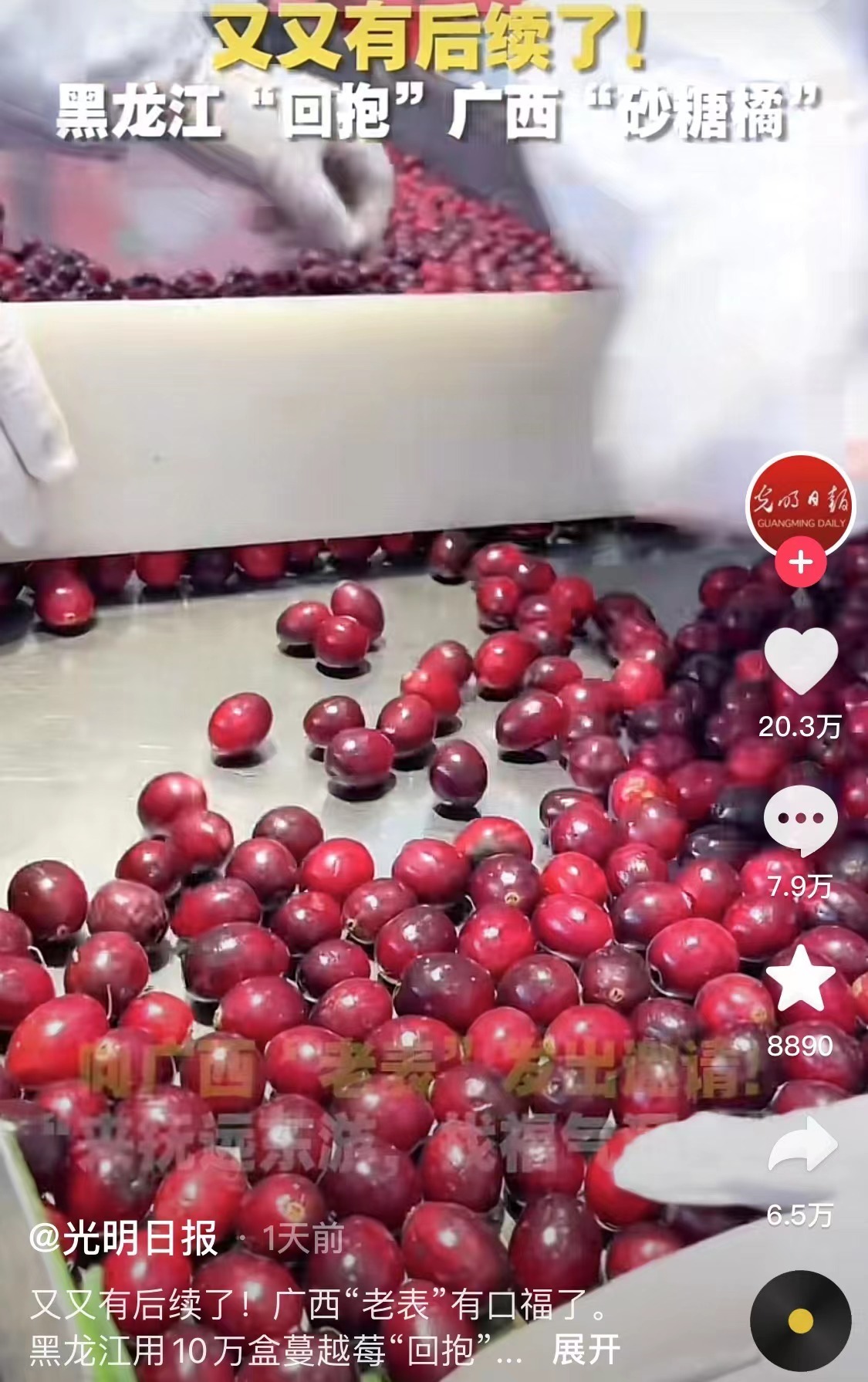 首先就是这次的浪“蔓”回礼的背后是南北两地的“双向奔赴”。一批广西的小朋友穿着橙色外套在哈尔滨游学,被热心的当地人一路守护,在网络上引发了热议。为了答谢东北“老铁”对“小砂糖橘”的暖心守护,广西花式回礼送给哈尔滨189吨砂糖橘和沃柑,黑龙江省抚远市则准备了10万盒优质抚远蔓越莓发往南宁作为回礼。一来一回,既是南北同胞跨越距离互相送上的温暖,也是中国的幅员辽阔、地大物博的缩影。
