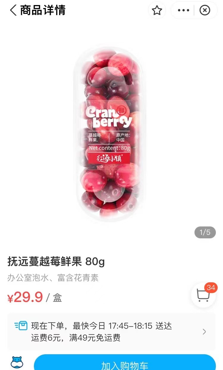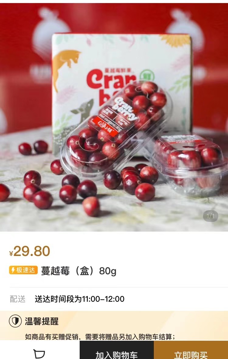 货架上的价格显示,80g新鲜蔓越莓售价为29.8元。静宝又搜索了各商超的线上平台,在citysuper超生活超市(兴业太古汇店)、盒马生鲜的静安寺周边各门店均有相同包装的新鲜蔓越莓出售,价格也同样都是29.8元/盒(80g)。