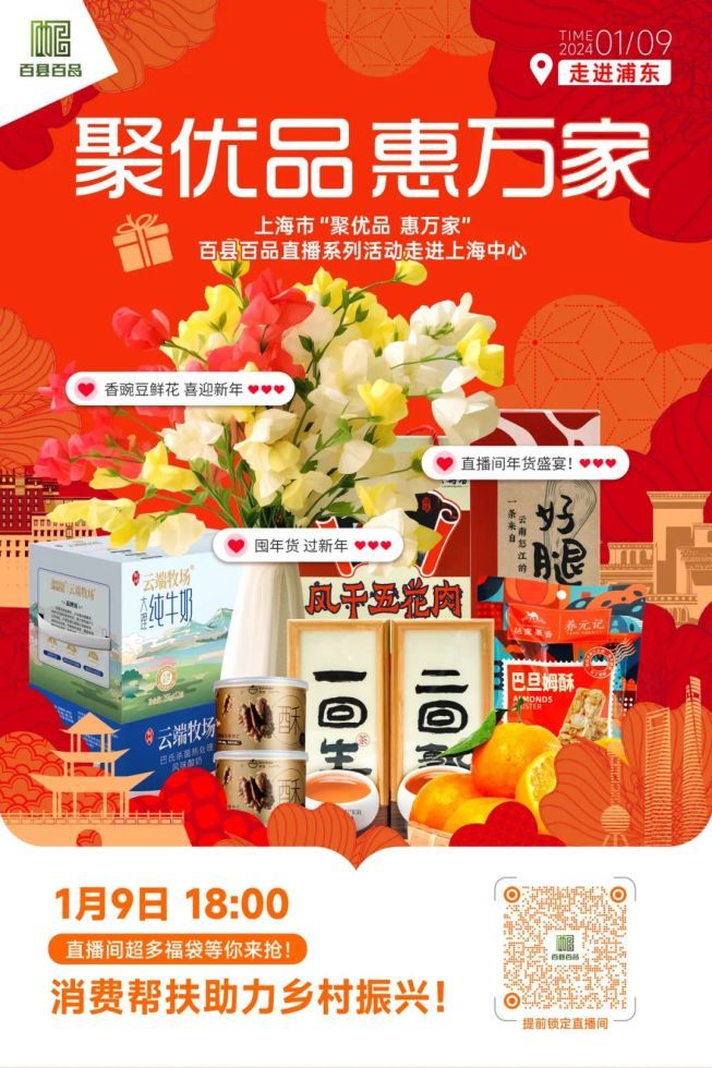 “聚优品 惠万家”百县百品直播活动来浦东啦!首次直播活动1月9日将在陆家嘴“三件套”陆家嘴金融城党群服务中心综合服务体举行。晚上18:00-20:00,锁定“百县百品”直播间。