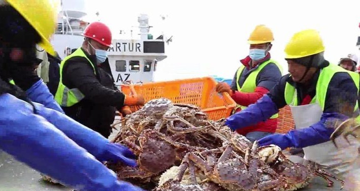 近日,一艘满载32吨帝王蟹的俄罗斯渔船在山东港口威海港靠岸,威海经开区进出口冷链智能配送基地迎来2024“开门红”。