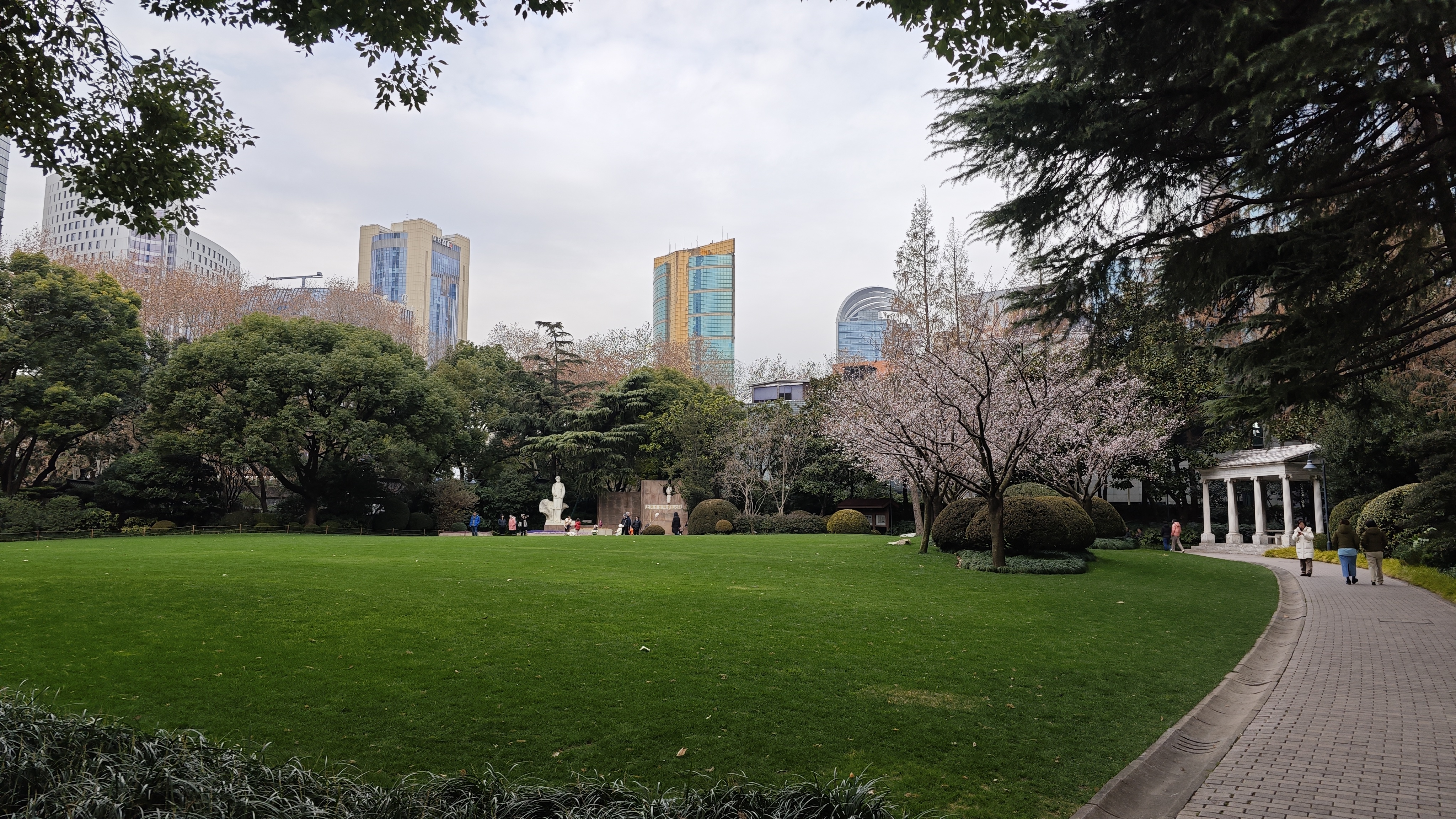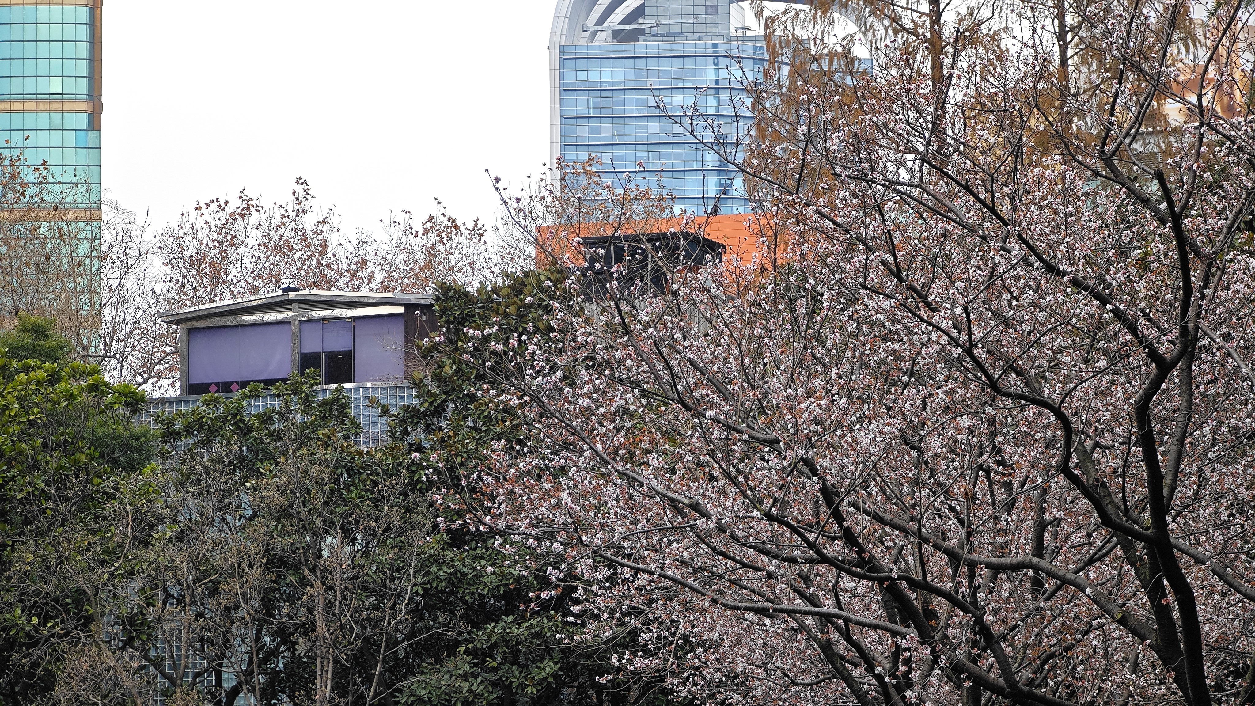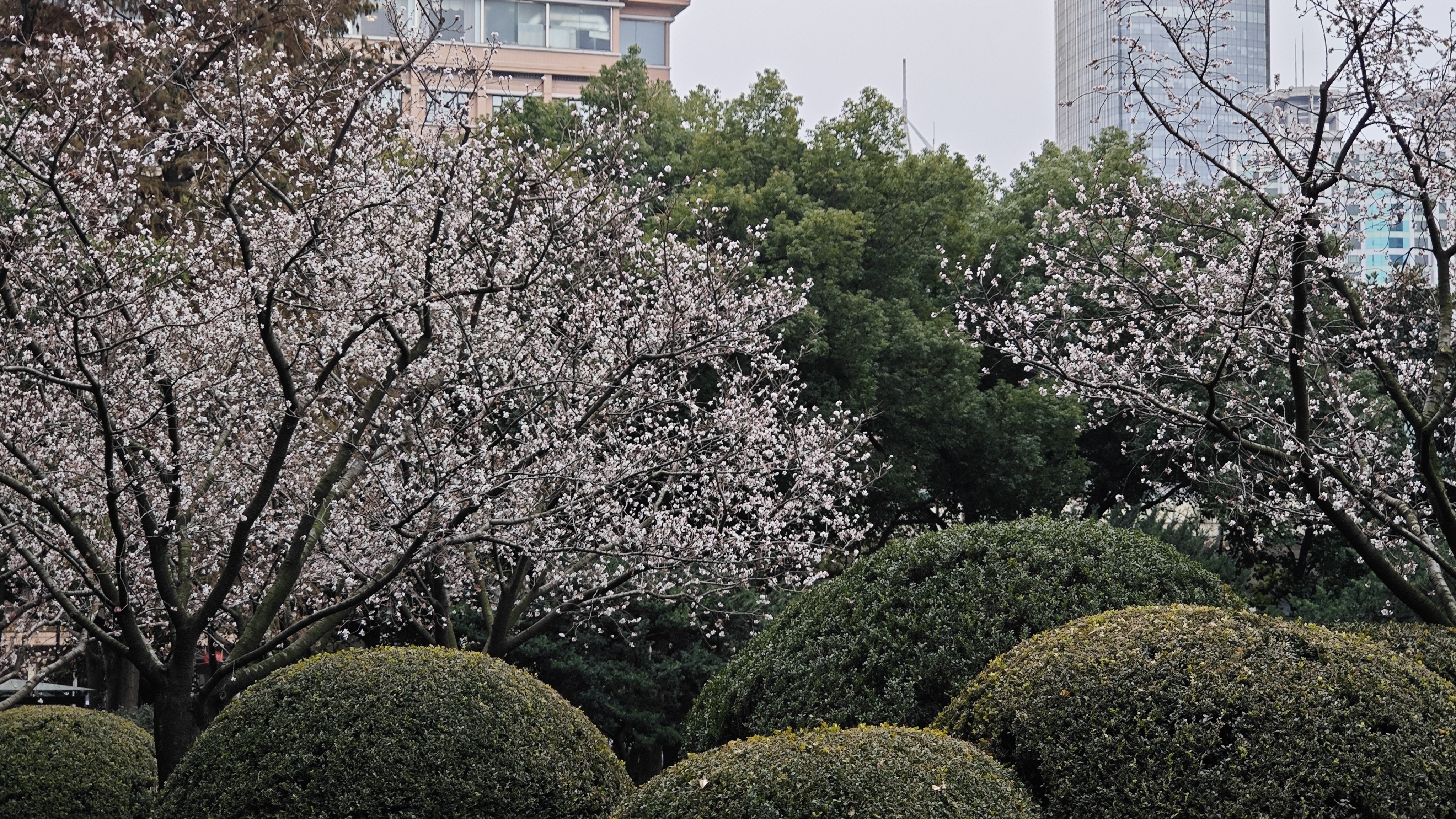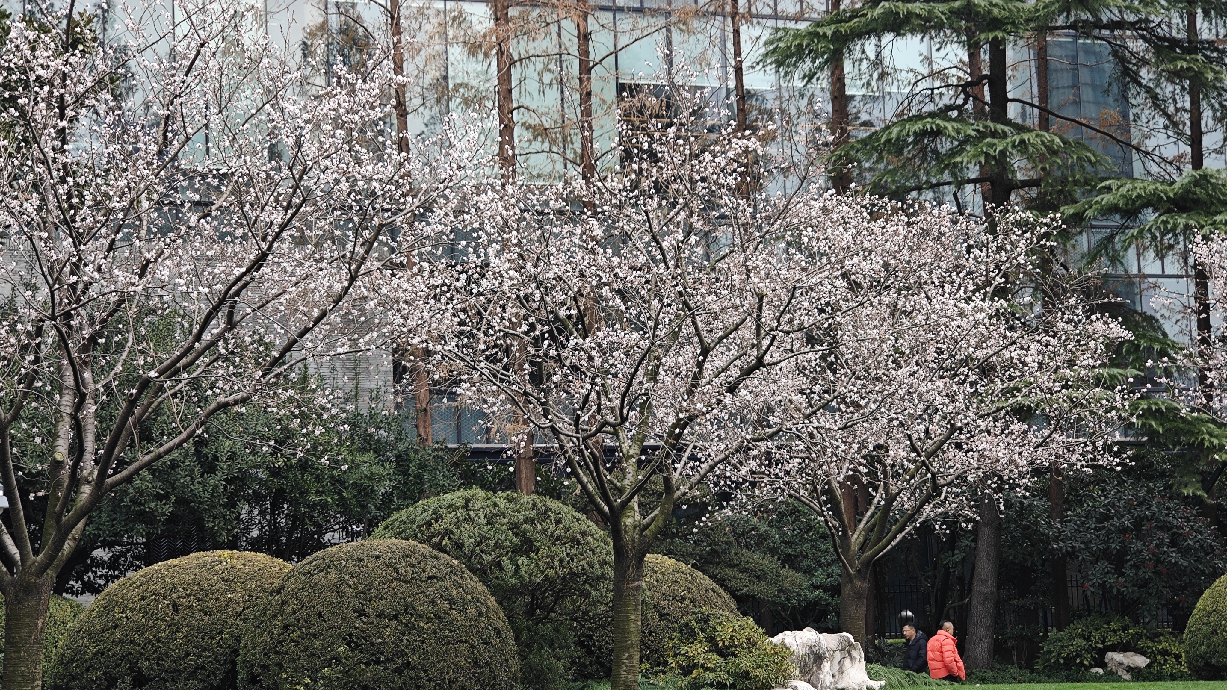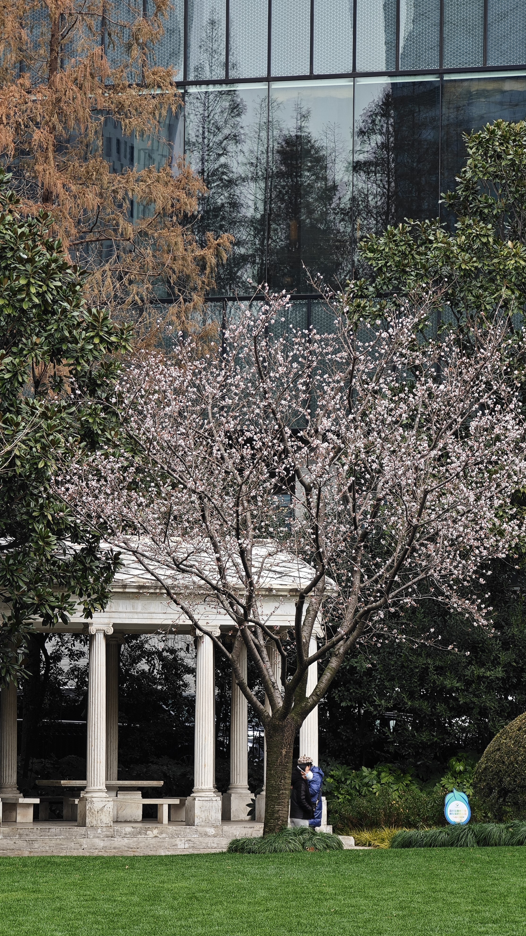 近日,静安公园内的6株大樱花相继盛放,为公园带来了今年第一场缤纷花舞。