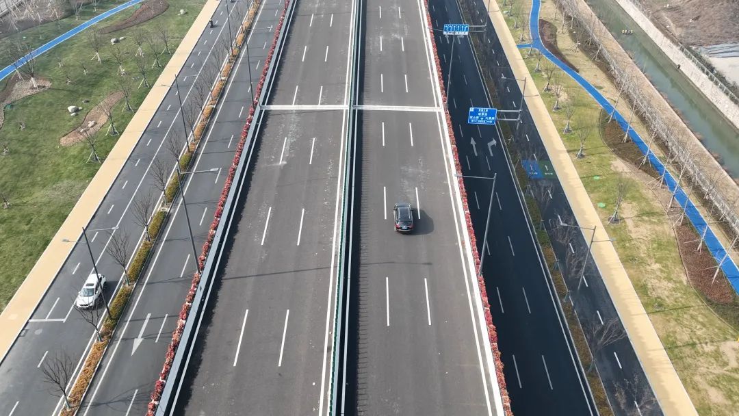空中俯瞰,隧道连接高架一路向东,地面道路两侧绿植打底、繁花点点、景观簇拥,原先单调的城市主干道两侧林带空间打开,伴随道路延伸的“诗画长廊”尽收眼底。
