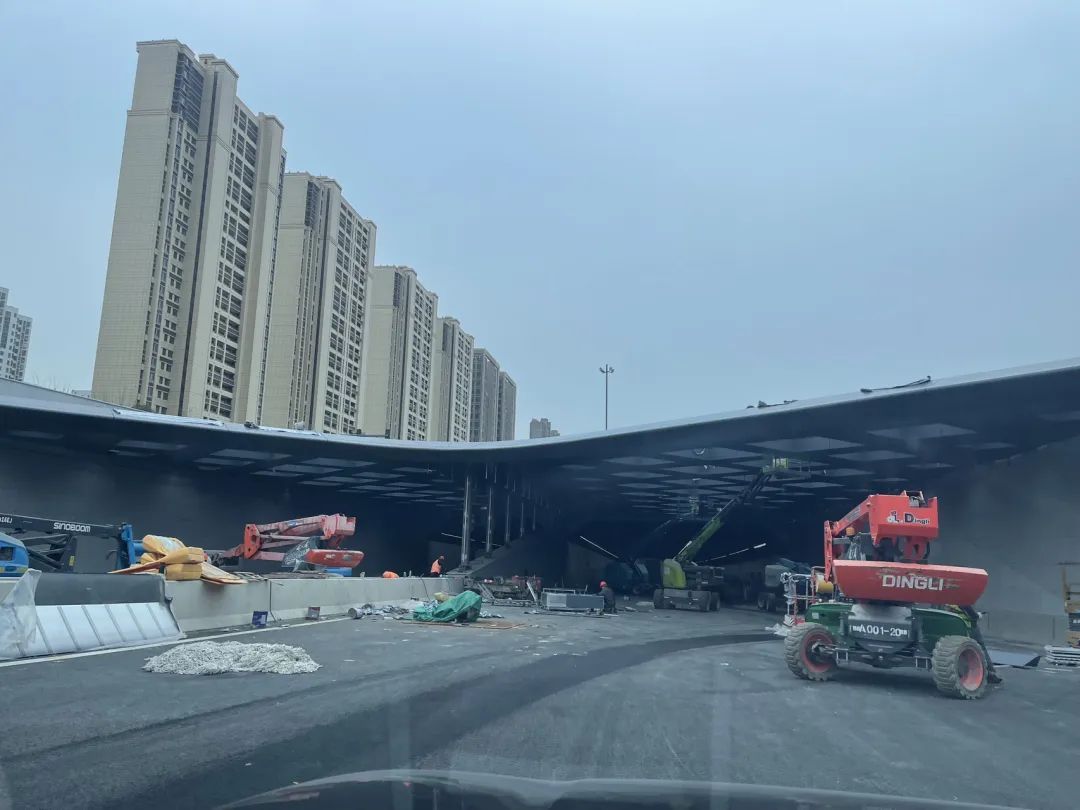 从瑞景道附近驶出隧道,与地面连接处的光过度棚采用菱形透光造型设计,从空中俯瞰,双向隧道出口顶棚犹如飞鸟展翅,科技感十足。