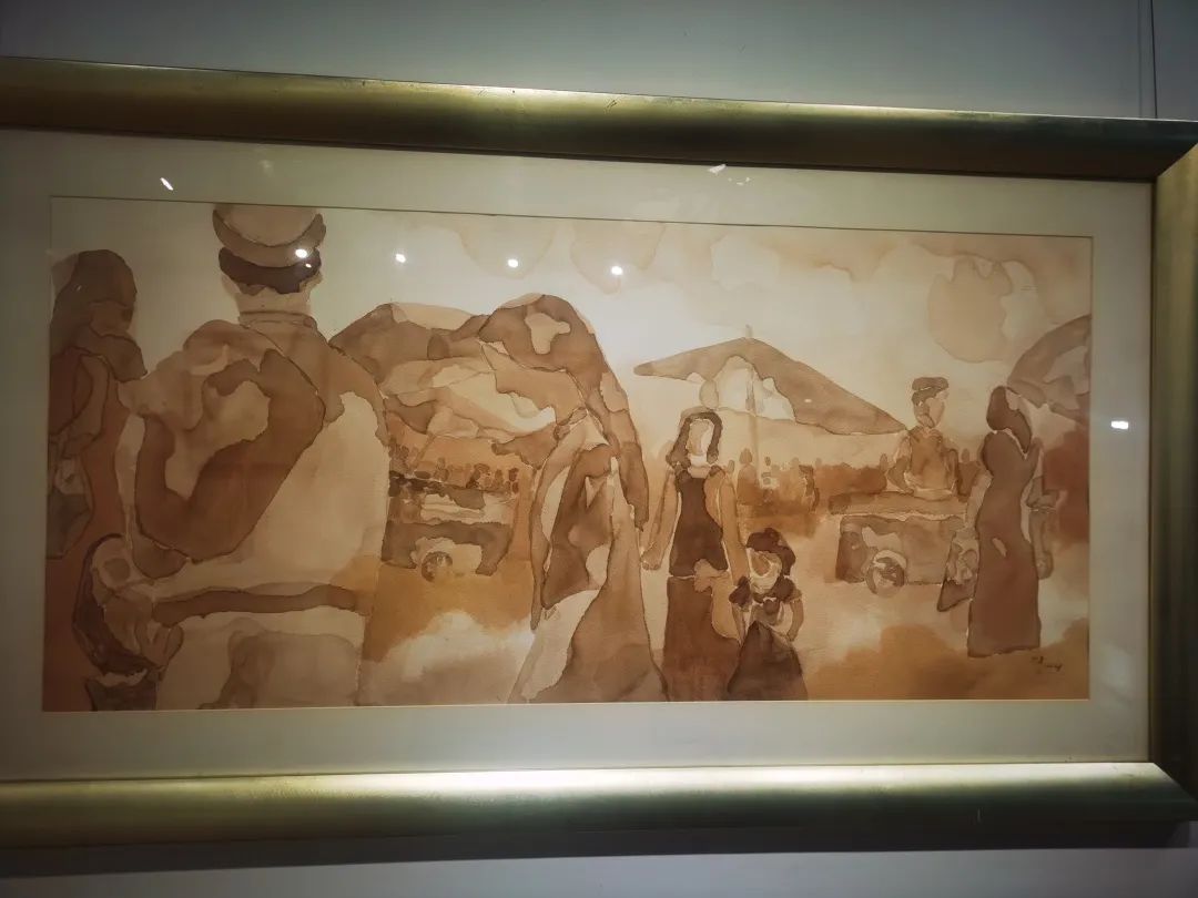 在上海定居的二十多年里,王海霞创作了大量都市题材的作品,画风也从早年的写实的水彩小品转变为抽象的写意。这些作品都陈列在展馆二层,有传统布艺绘画、新疆风光、外滩风景及个人写意等。其中,一组布艺小品让人眼前一亮,画中的香包、金锁都是中国传统老物件,用水墨的手法描绘出来,别具一格。王海霞介绍,这组作品曾经参加过日本东京都美术馆的邀请展,国潮风很受外国人的欢迎。