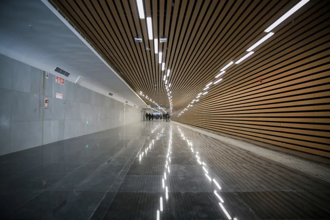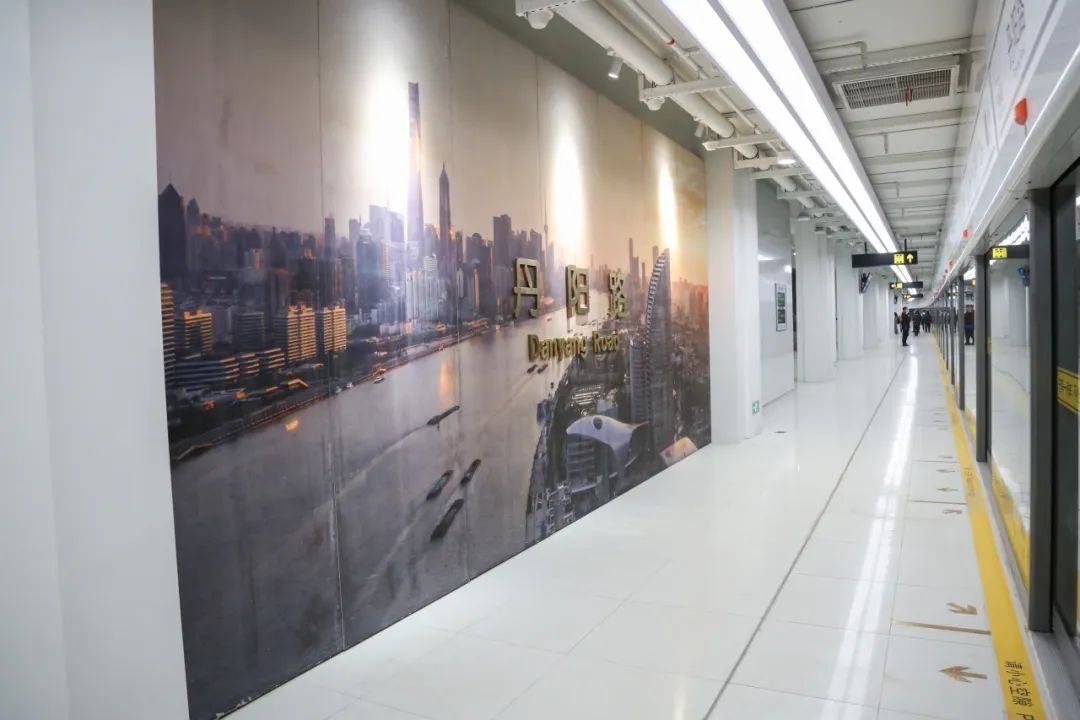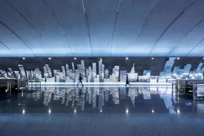 站厅中最引人注目的设计,则是两侧展示上海城市景观的景墙。一幅长达70多米的画卷,通过LED灯带将浦江两岸的天际线动感呈现,乘客穿过地铁站的长廊,就像穿过一个展示上海改革开放城市建设的华丽展厅。