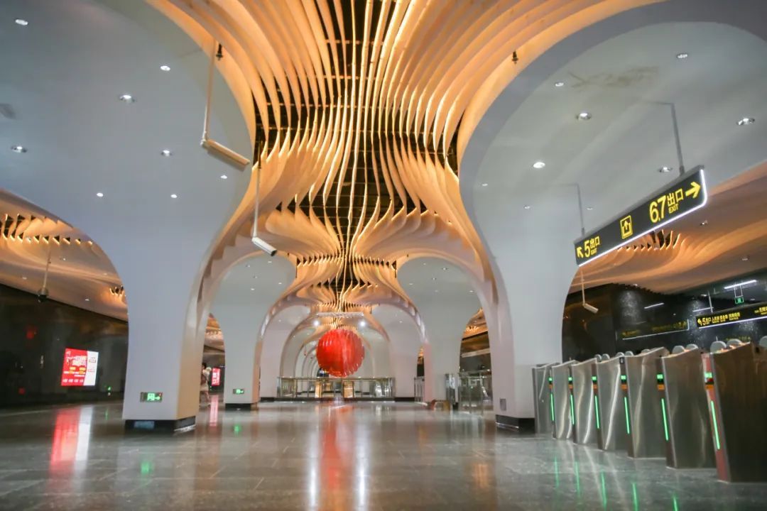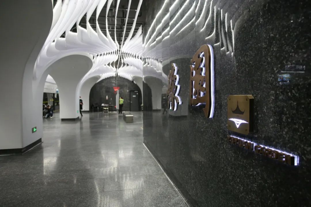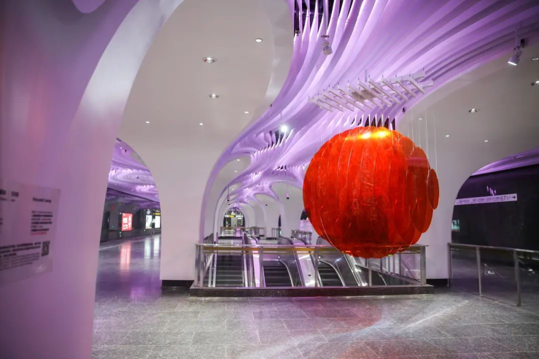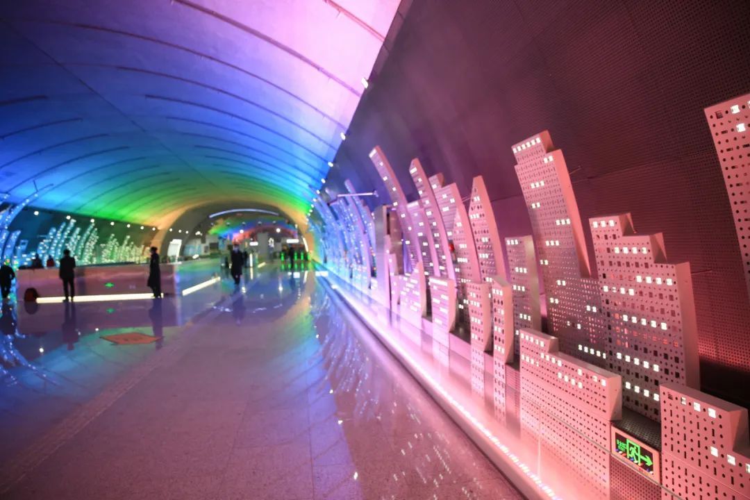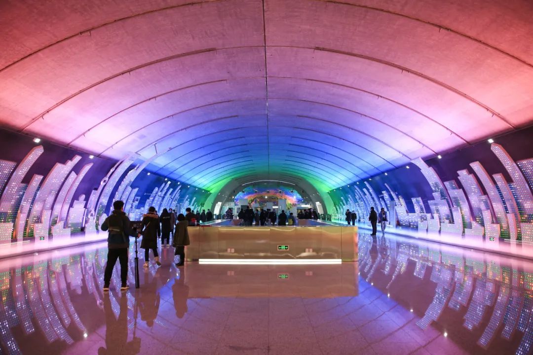 地铁14号线豫园站的站内大厅,也被称为“上海脉搏”。车站的顶部设计有蜿蜒曲折的褶皱灯带,层层铺设开来,形成一个超大的LED三维屏幕。在不同时间里,装饰灯光也会变幻出橙、紫、蓝、白等多种色彩,将空间艺术和光影艺术完美融合在一起,创造出一个个神奇而梦幻的立体空间。