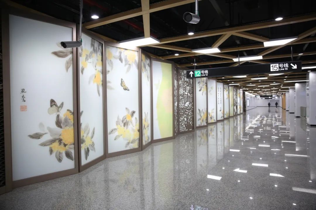 桂林公园走文人画风,墙面折线的设计宛若古典园林中的屏风,一秒带你穿越悠悠古韵情境。站厅内的柱子横梁运用了中式窗格元素,尽显江南园林意境之美。