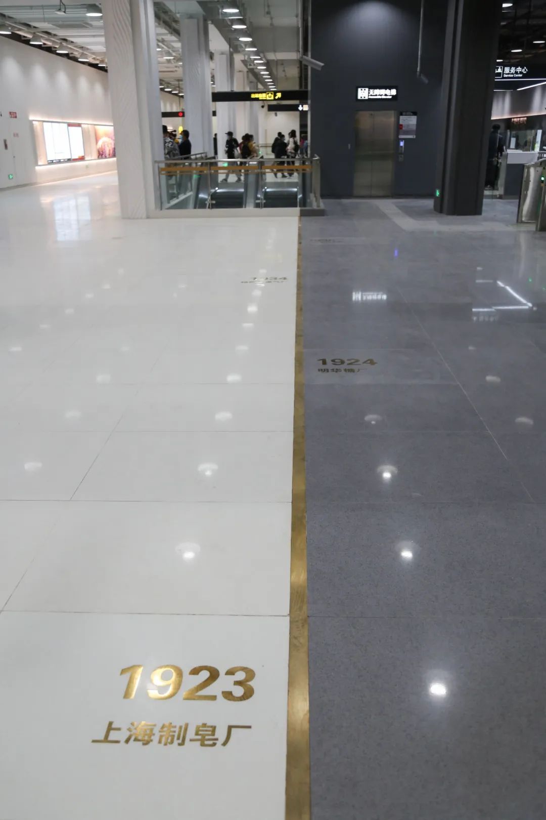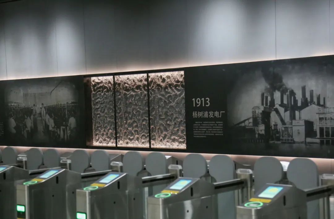 地铁站里,黑色墙面上介绍着杨浦百年工业历史,如杨树浦发电厂、上海制皂厂、毛麻仓库等;白色墙面上则有电子屏展示新杨浦的发展景象。通过各种细节,展示着杨浦滨江从“工业锈带”到“生活秀带”的变迁史。