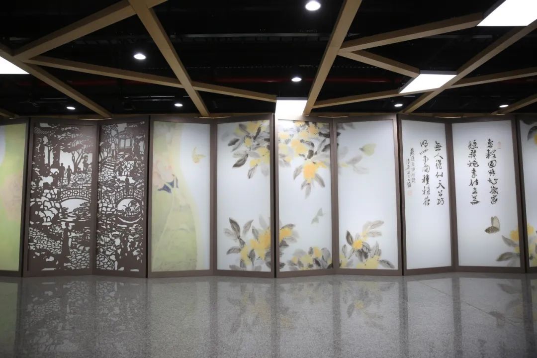 折面上装饰着桂林公园亭台楼阁的剪影以及各种国画桂花、蝴蝶蜻蜓、词句书法等等,就连地面上,都有桂花的印记。可以说这设计十分贴合桂林公园的特色了。
