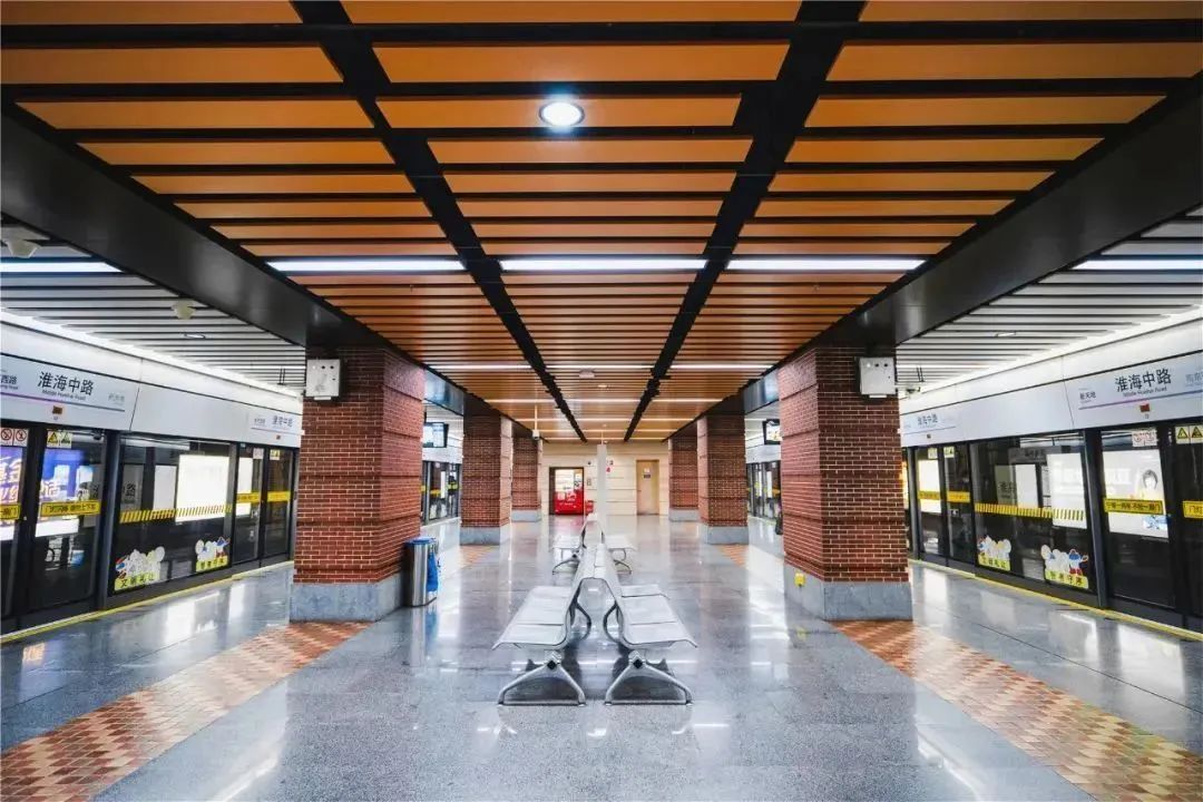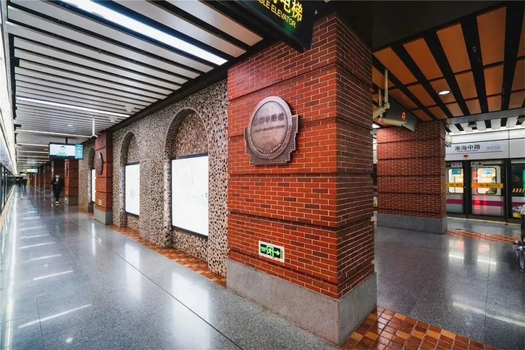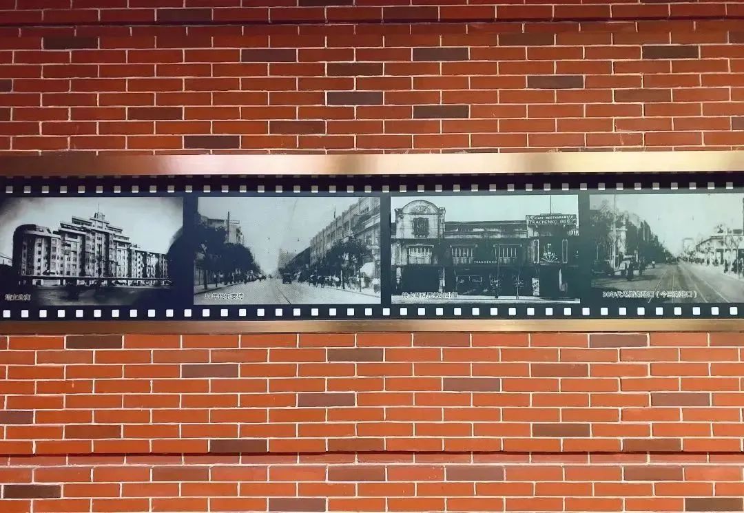 老上海的卵石墙、红砖墙、小地砖、古铜站牌……站内满是海派风情,目光所及之处,都是上海宁的记忆。站台两侧还有专属怀旧长廊,展示着淮海路周边的历史建筑及旧照。