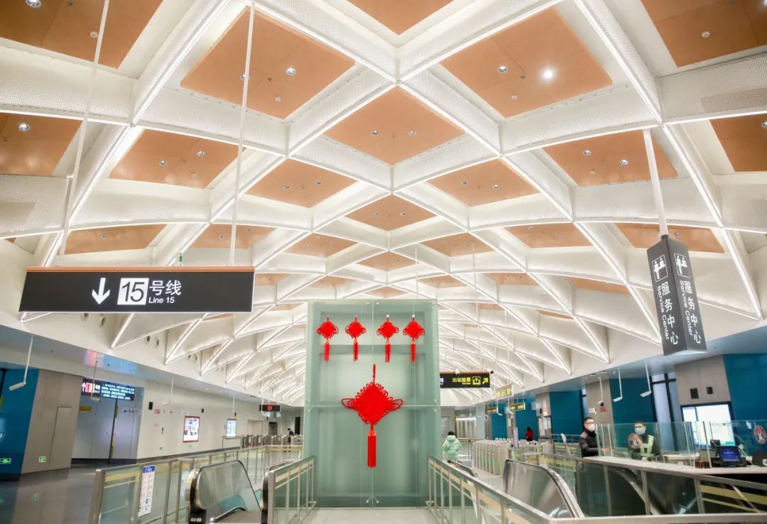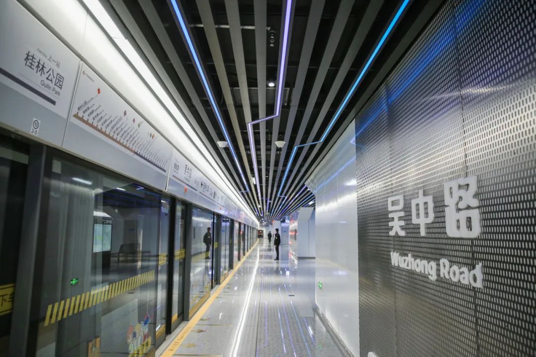 地铁15号线吴中路站被称为“上海最漂亮的地铁站”。设计师在15号线的地铁站站厅设计上做了创新,在吴中路站采用净跨达到21.6米的预制大跨叠合拱型结构,从而创造了上海地铁首例无柱的无遮拦大空间站台大厅。