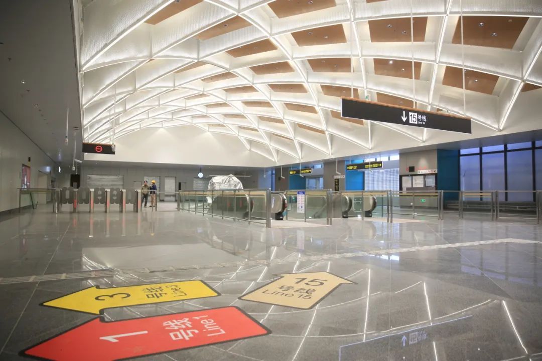 15号线上海南站站采用“无柱拱顶”结构型式,凸显“无遮挡大空间”的视觉观感,营造出火车站特有的超大空间感。带有棱角的造型更加凸显了立体感,焦糖色的几何色块做成“穹顶”,抬头仰望,便是美到极致的“美拉德”。