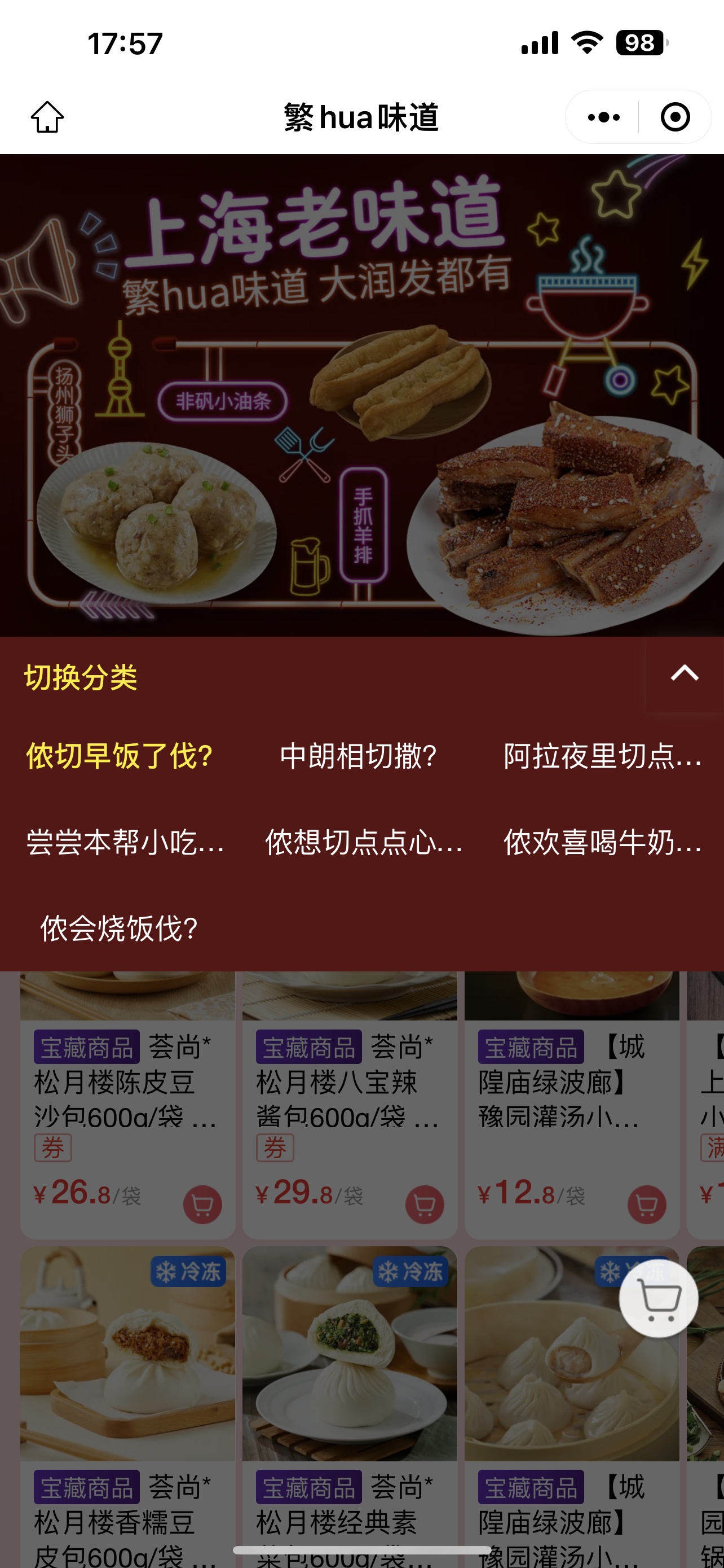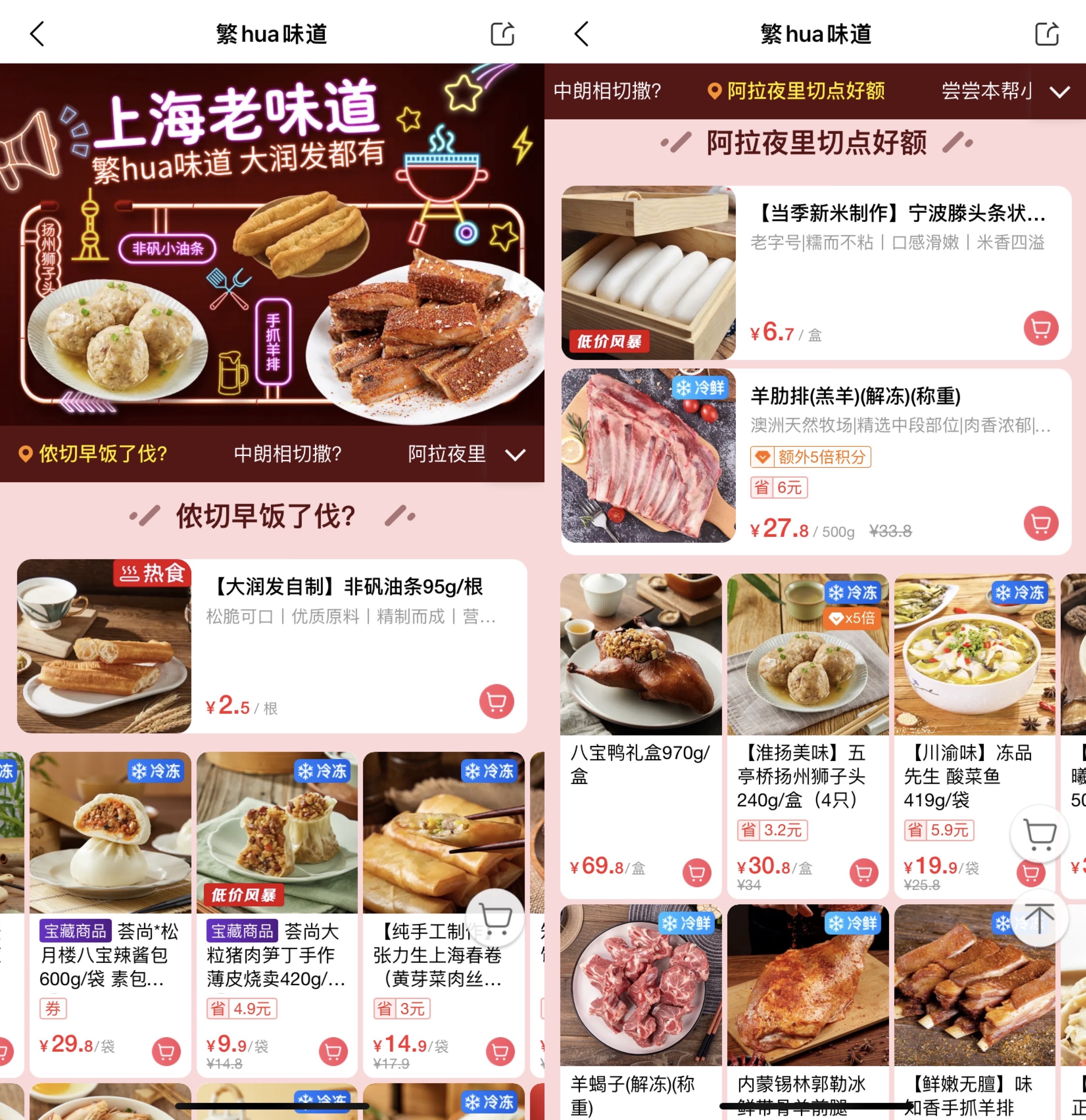 “侬切早饭了伐?”“中朗相切撒?”“阿拉夜里切点好伐?”“侬想吃点点心伐?”“尝尝本帮小吃额味道”.......进入大润发优鲜APP“上海老味道”专题页,七个采购功能区按照“早、中、晚、夜宵”进餐顺序在此依次排列。