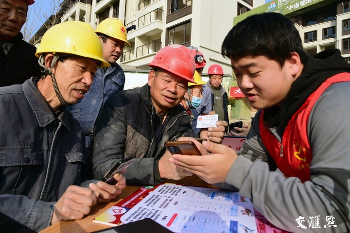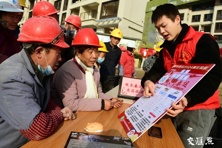 2024年1月12日,2024年春运火车票开售,江苏大学志愿者来到镇江市润州区官塘桥村辖区建设工地,向外来务工人员传授互联网订购春运车票的操作方法,并提供网上购票服务,温暖“回家路”。石玉成 於伟杰 摄 视觉江苏网供图