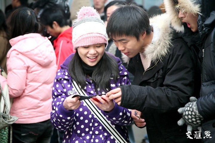 2009年1月8日,南京,寒风中,学生们挤在一起相互取暖,在火车票代售点等候窗口开始售票。 任国勇 摄 视觉江苏网供图