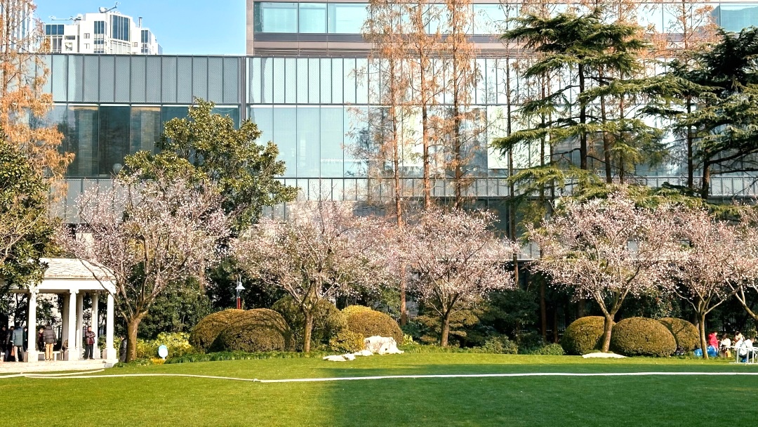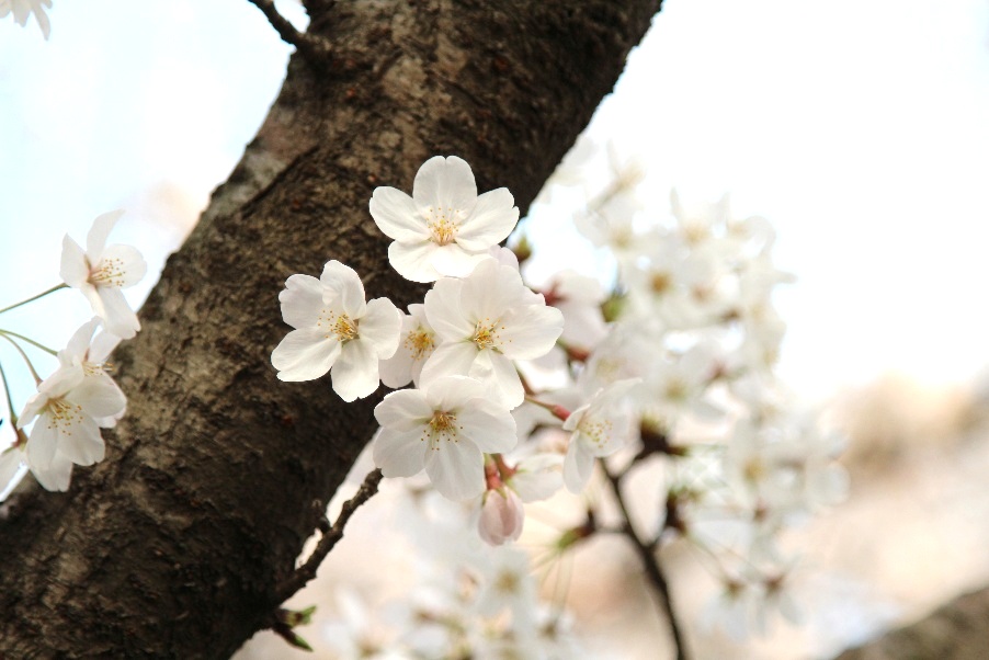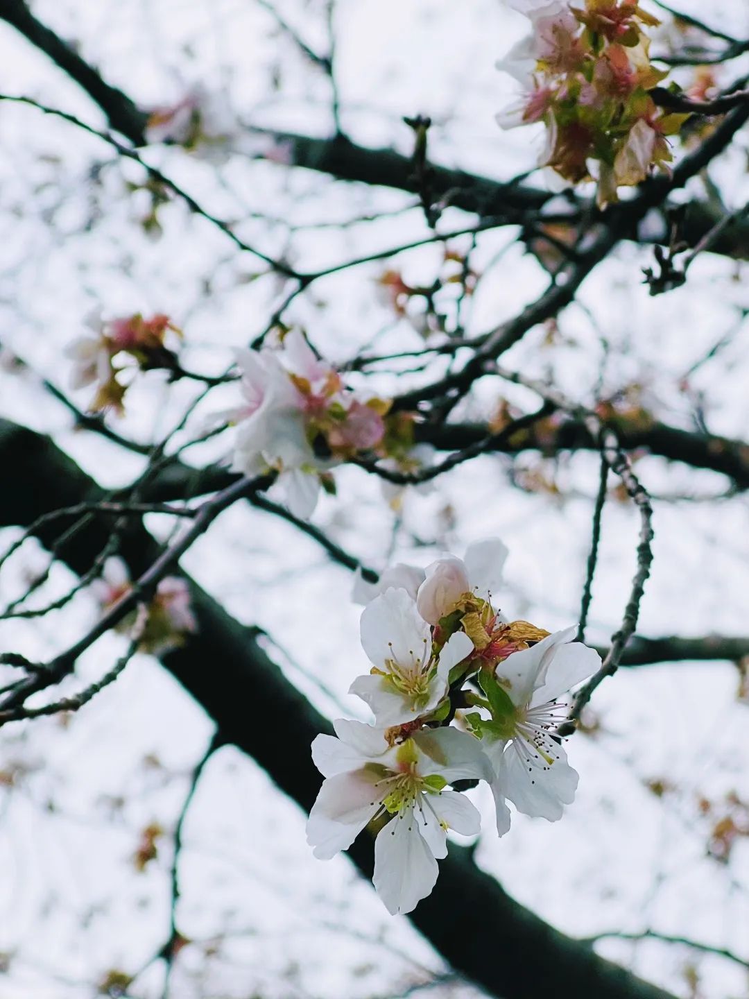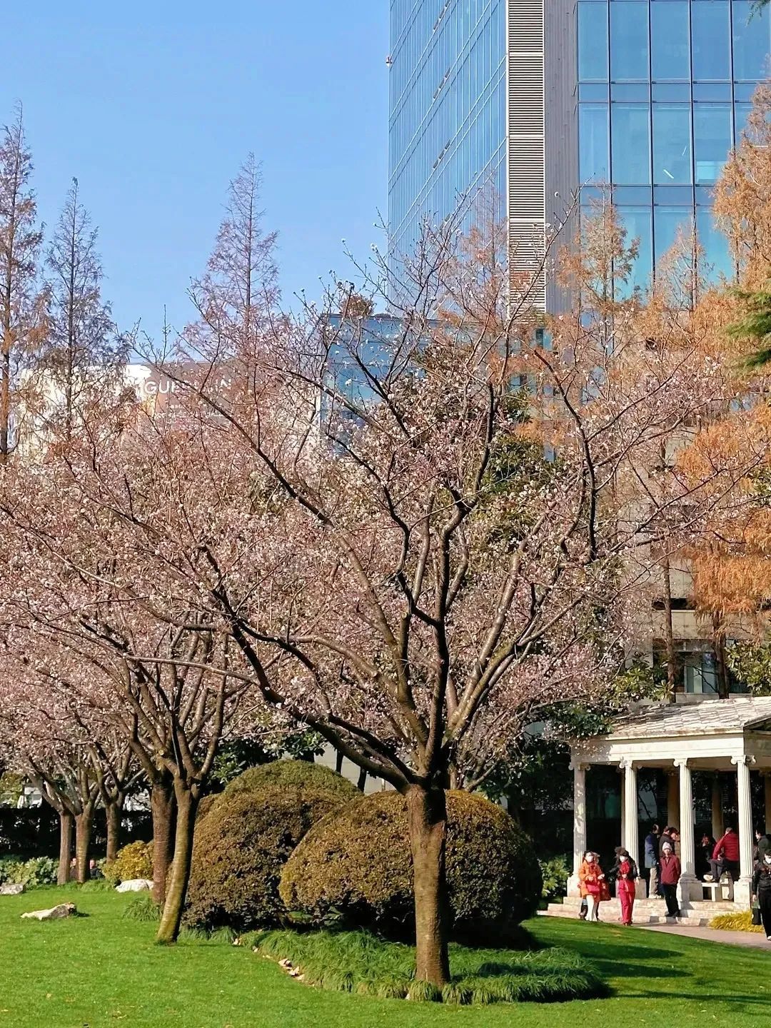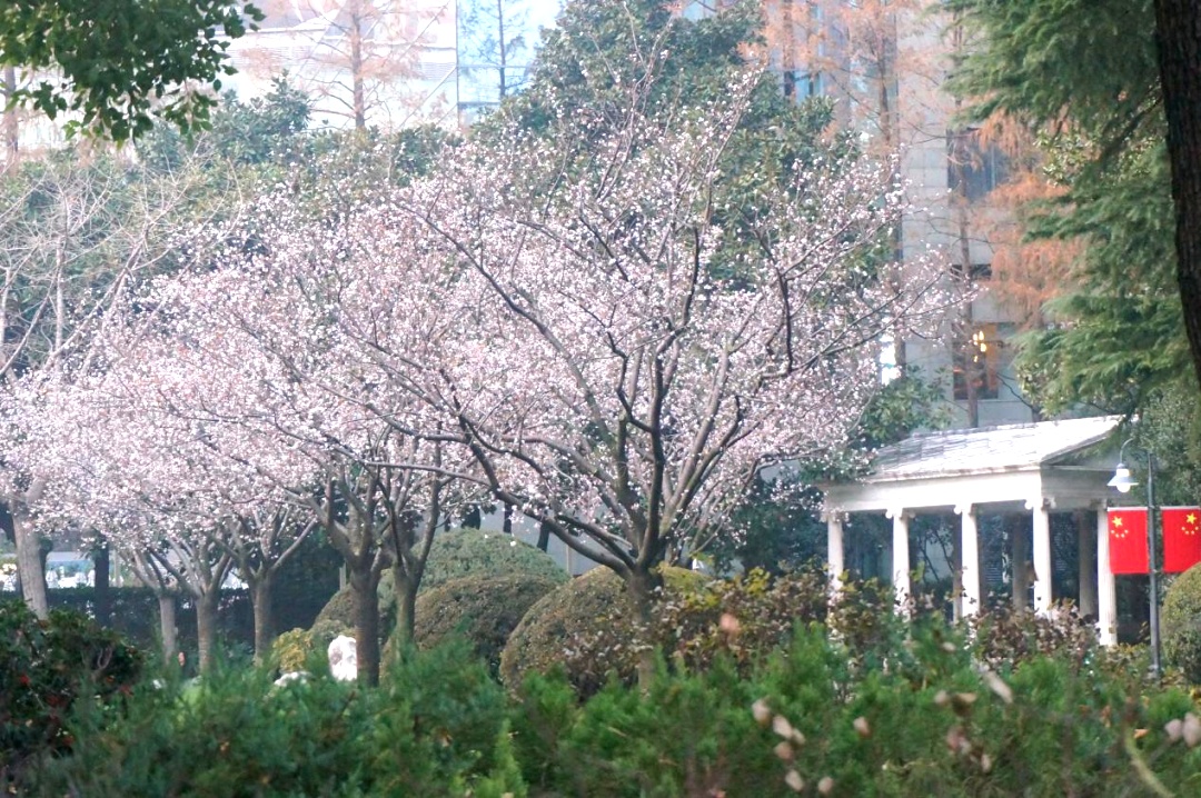 最近在静安公园的草坪上几株盛放的乔木,远看繁花烂漫,怒放枝头,近看朵朵白花,微露红晕,看着像我们常见的染井吉野。但樱花一般在二、三月才盛开的呀,为什么这时候花量会如此之多?