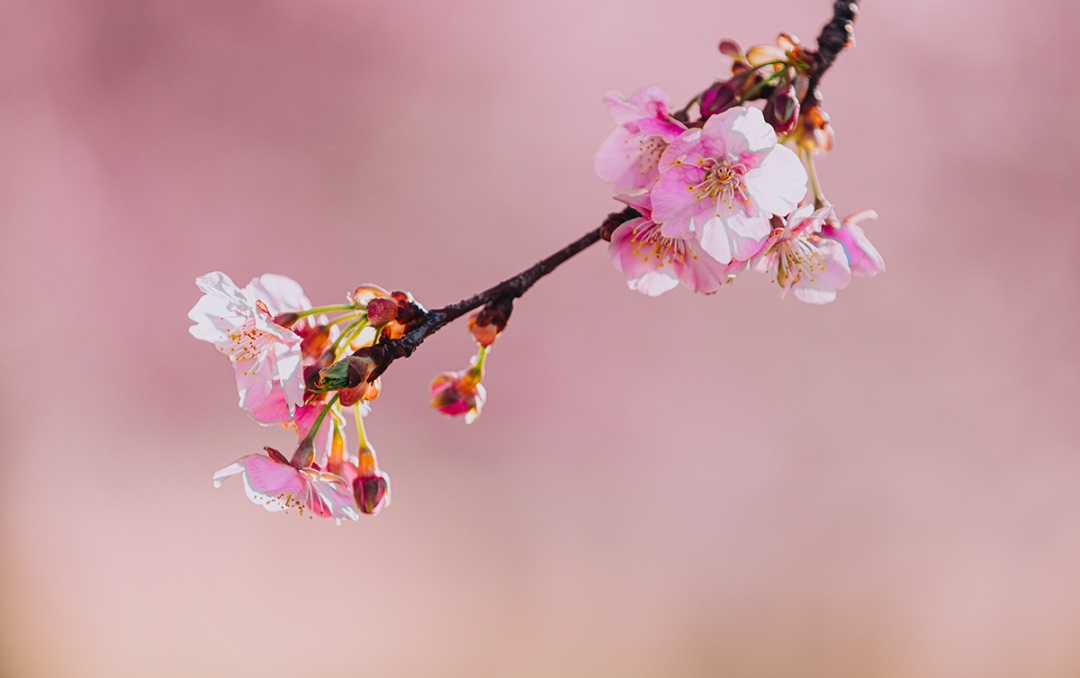 樱花原产中国,因深受亚洲和欧洲学者的青睐,繁衍出众多观赏价值较高的园艺品种,形成了现在近50个种(及变种)的庞大家族。一般我们可以按照花期将其分为早樱、中樱、晚樱和两季樱。例如‘河津樱’早在2月下旬悄然盛开,最常见的染井吉野3月中旬怒放枝头,重瓣的‘松月’4月初绽放出浓浓的春意,‘十月樱’除了4月绽放还会在10月默默盛开。