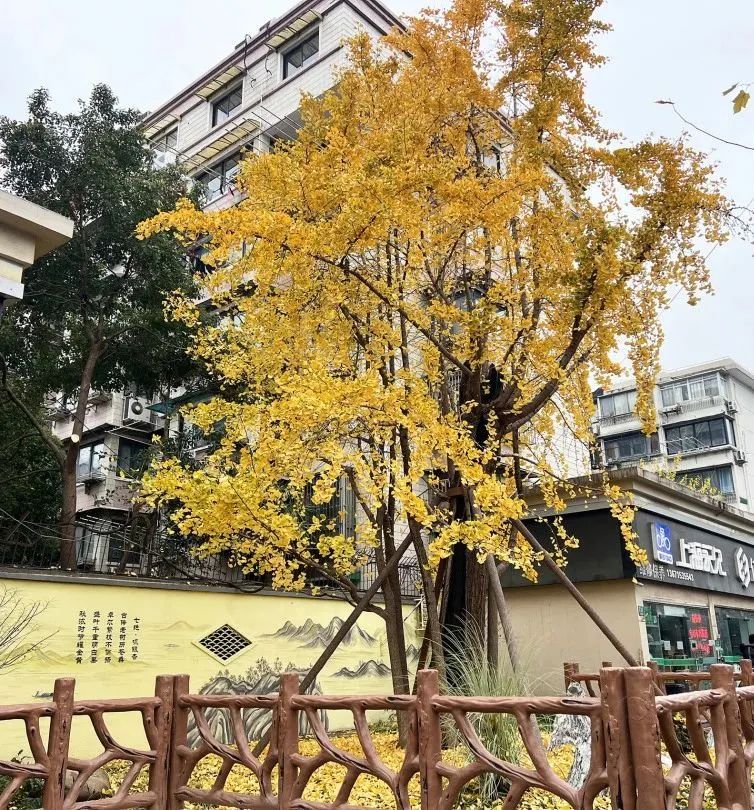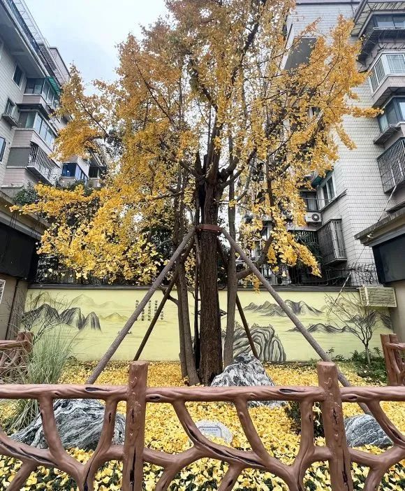 专业检测机构也对土壤取样分析,并根据检测报告进行土壤改良。为防止电动车乱摆放影响古树,古树树坛两侧加宽至与商铺门面对齐,与原有两侧角落花坛整体连接,外侧围边安装水泥高仿木栏杆。背景墙为彩绘水墨山水画,题写银杏主题古诗,营造中式园林意境。