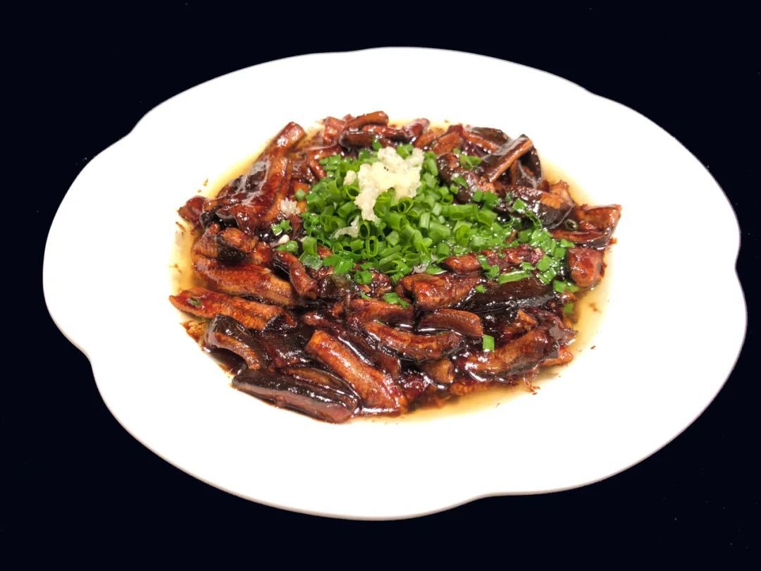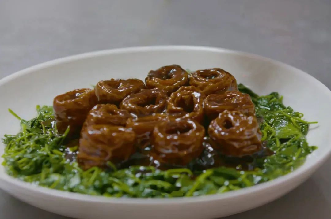 色泽酱红,肠肉酥烂,肥而不腻,草头碧绿,柔软鲜嫩,清香入味。