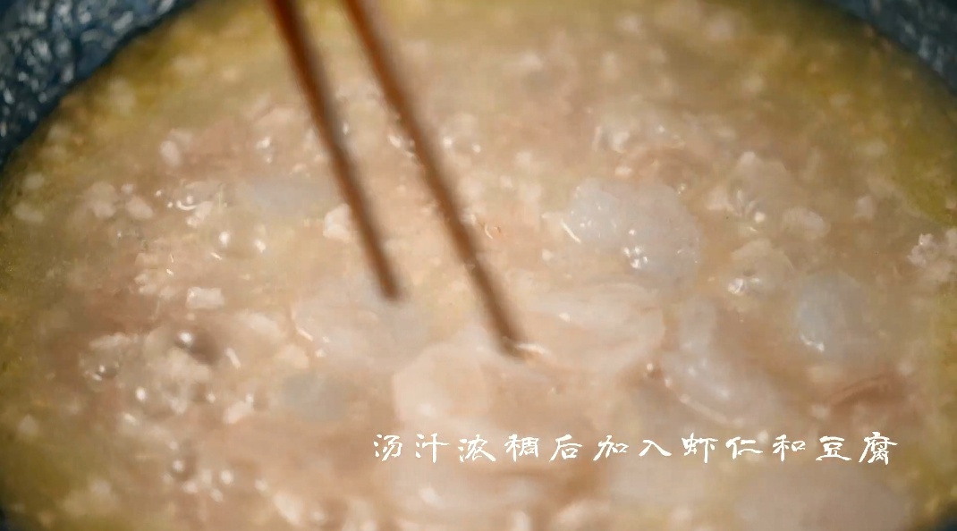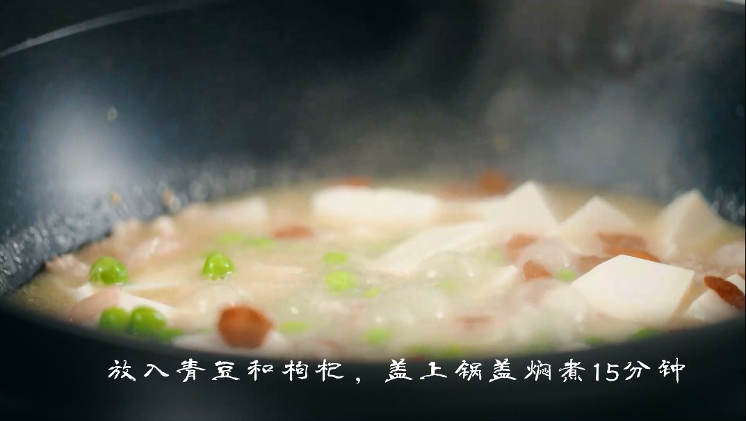 4.汤汁浓稠后放入腌制好的虾仁、豆腐、青豆、枸杞,盖上锅盖焖煮15分钟。