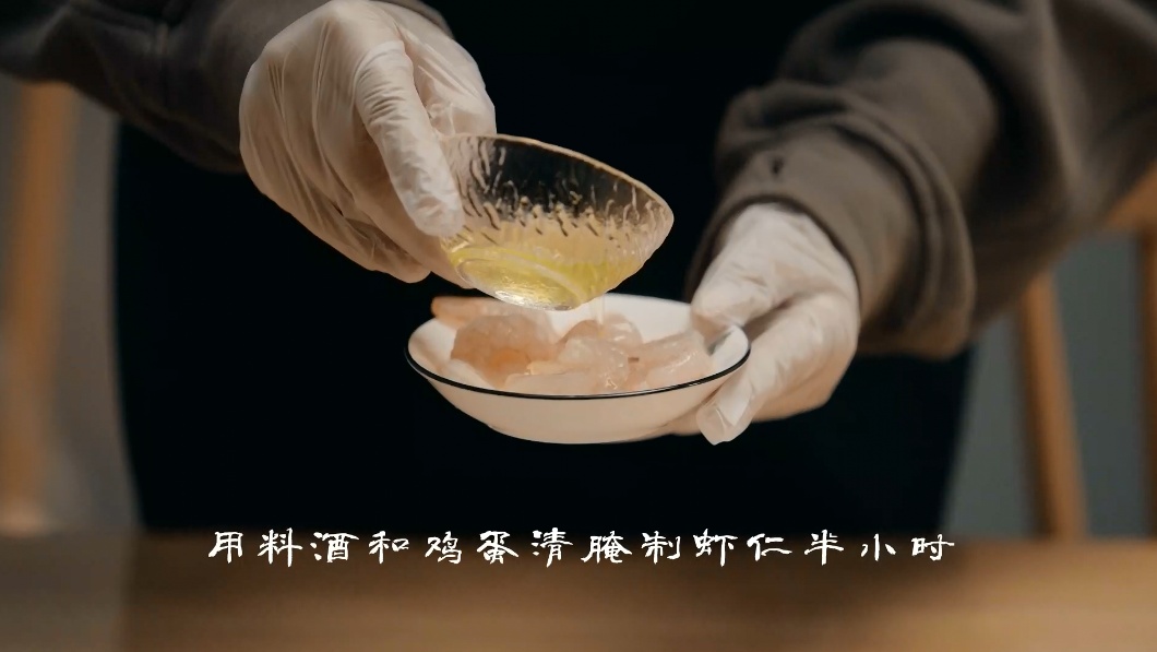 1.用料酒和鸡蛋清腌制虾仁半小时。