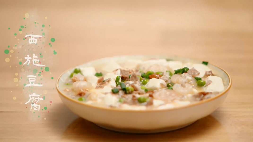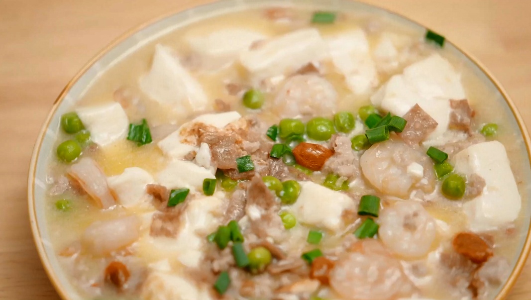 食材:豆腐、火腿末、虾仁、肉末、青豆、枸杞、鸡蛋、姜末、葱花、高汤