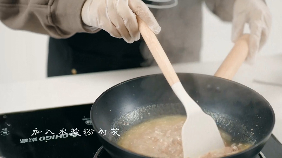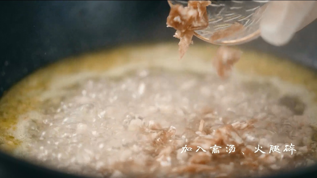 3.倒适量高汤烧开,加入火腿末,加盐、鸡精和胡椒粉调味,后加入水淀粉勾芡。